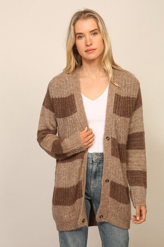 A cozy and stylish cable knit cardigan, featuring a multi-stripe pattern and adorned with snap-on buttons. This long sleeve cardigan is perfect for adding a touch of charm and sophistication to any outfit.