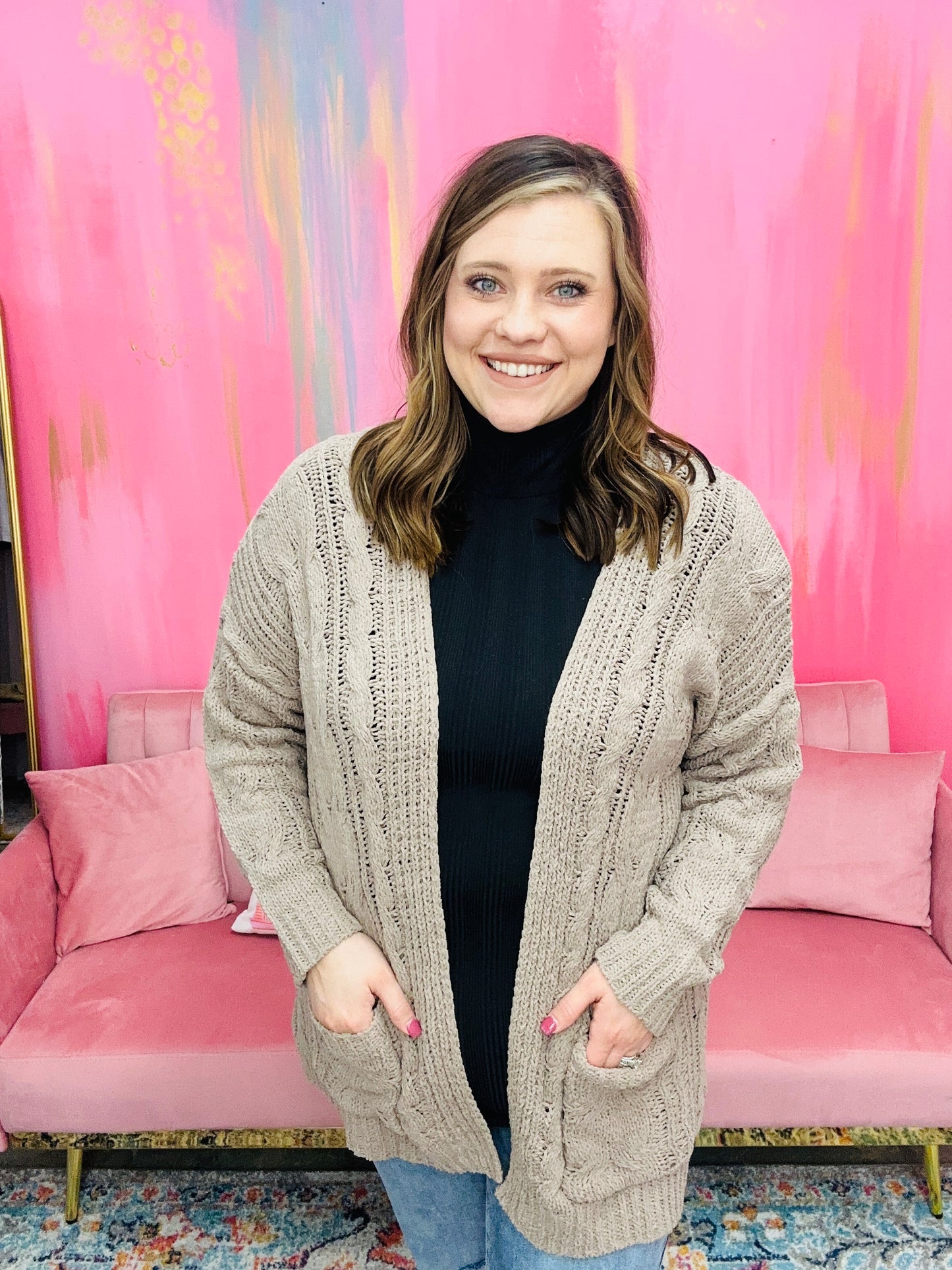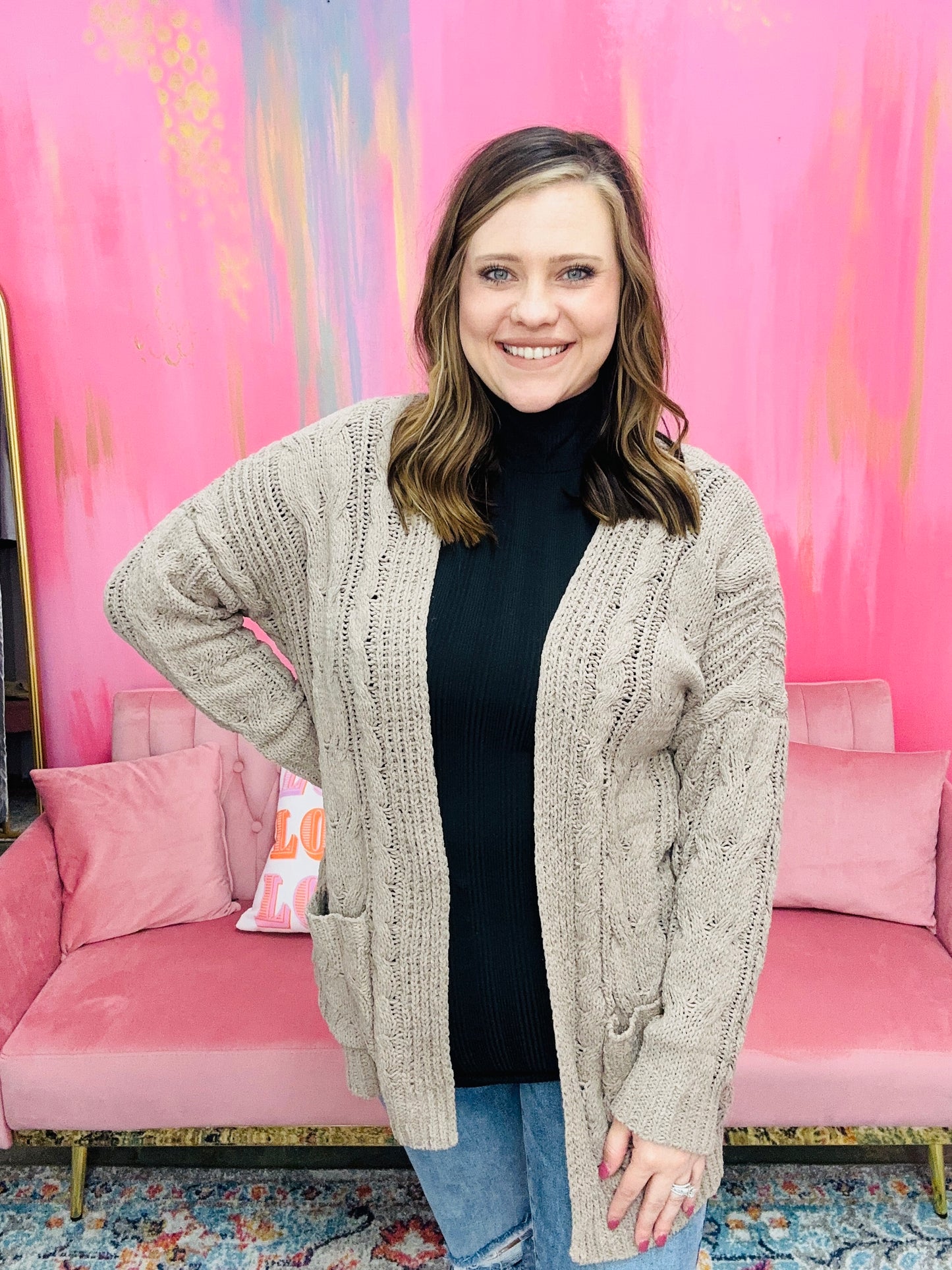 This is a ribbed hem cardigan with 2 side pockets. It has a long bodice and a relaxed fit silhouette. It is lightweight knitted fabric. It provides ultra comfort for cold weather.