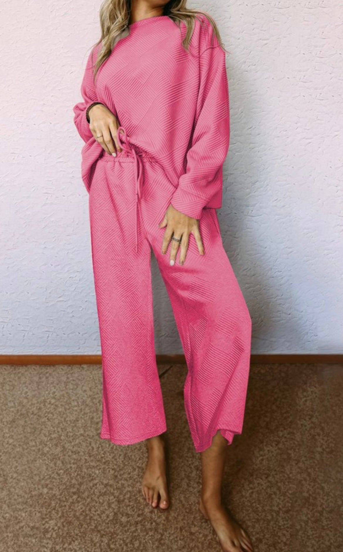 You don't need to worry about matching your outfit with this slouchy outfit This outfit consists of a long-sleeved top and wide-leg pants with drawstrings The solid color design with textured fabric is simple and not easily dated The ultra-loose cut gives you a comfortable wearing experience