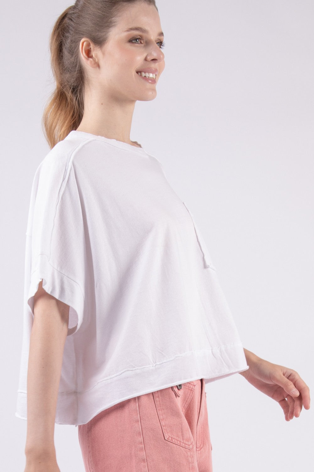 Introducing our Oversized Washed Crop Comfy Knit Top. Made with a relaxed fit, this top feature a round neck, short sleeves, and a drop shoulder design. The oversized style and patch pocket add a touch of laid-back comfort to any outfit. Perfect for those seeking an effortlessly stylish and relaxed look.