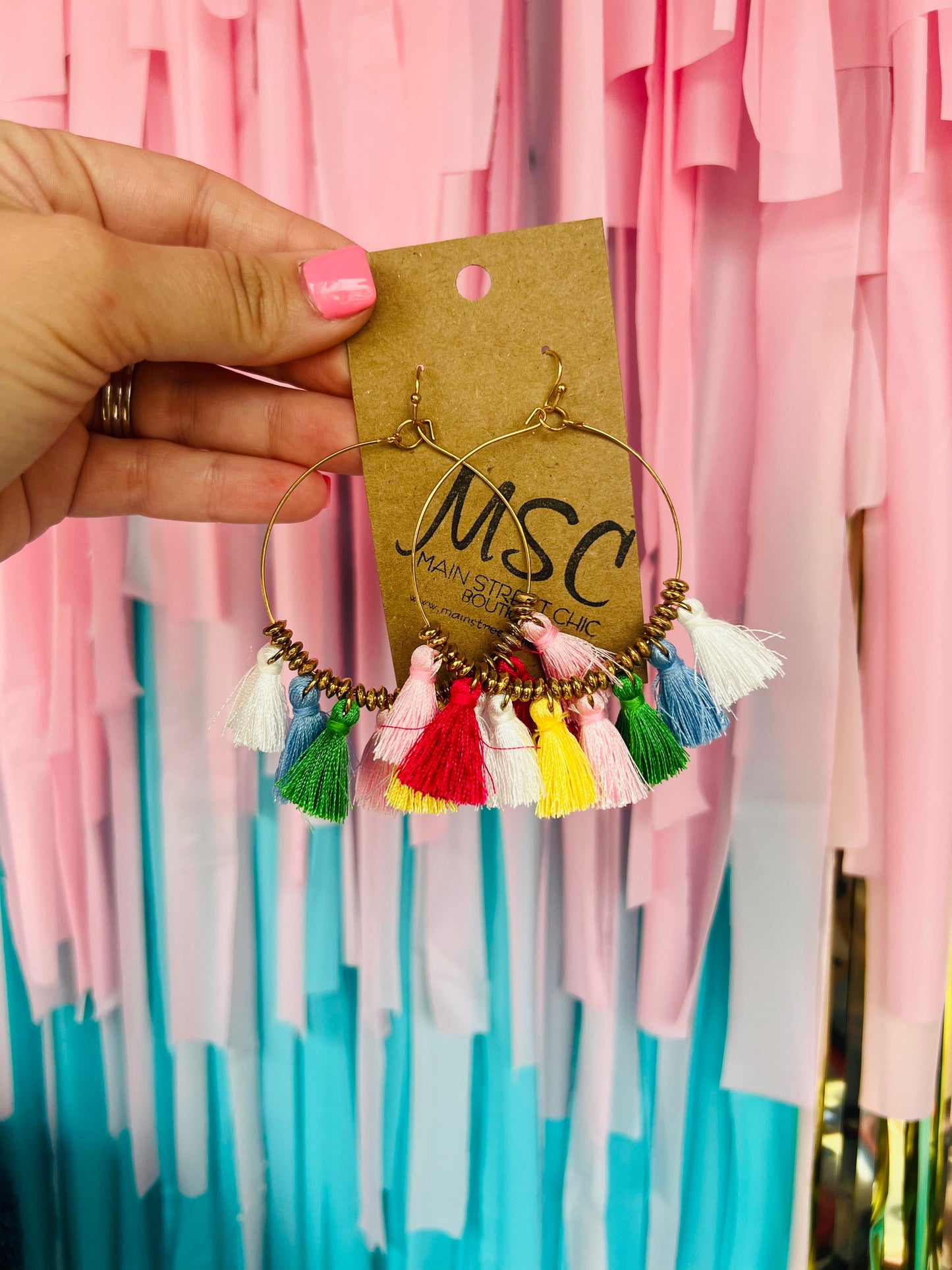 These colorful BOHO TASSEL DROP EARRINGS are sure to brighten any ensemble. Lightweight and fashionable, these earrings feature a multicolored tassel design and a gold plated alloy frame for an eye-catching look. Enjoy effortless style, wherever you go.