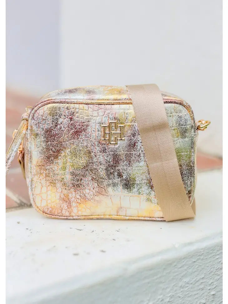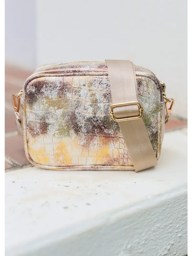 This sleek, camera-style crossbody is perfect for everyday use. Crafted with metallic vegan leather, it features an adjustable and removable strap, a pull tie accent on the zipper, and Caroline Hill's logo on the side. With a 6.25" tall, 8.5" wide, and 3" base, it is compact and secure for all your essentials.