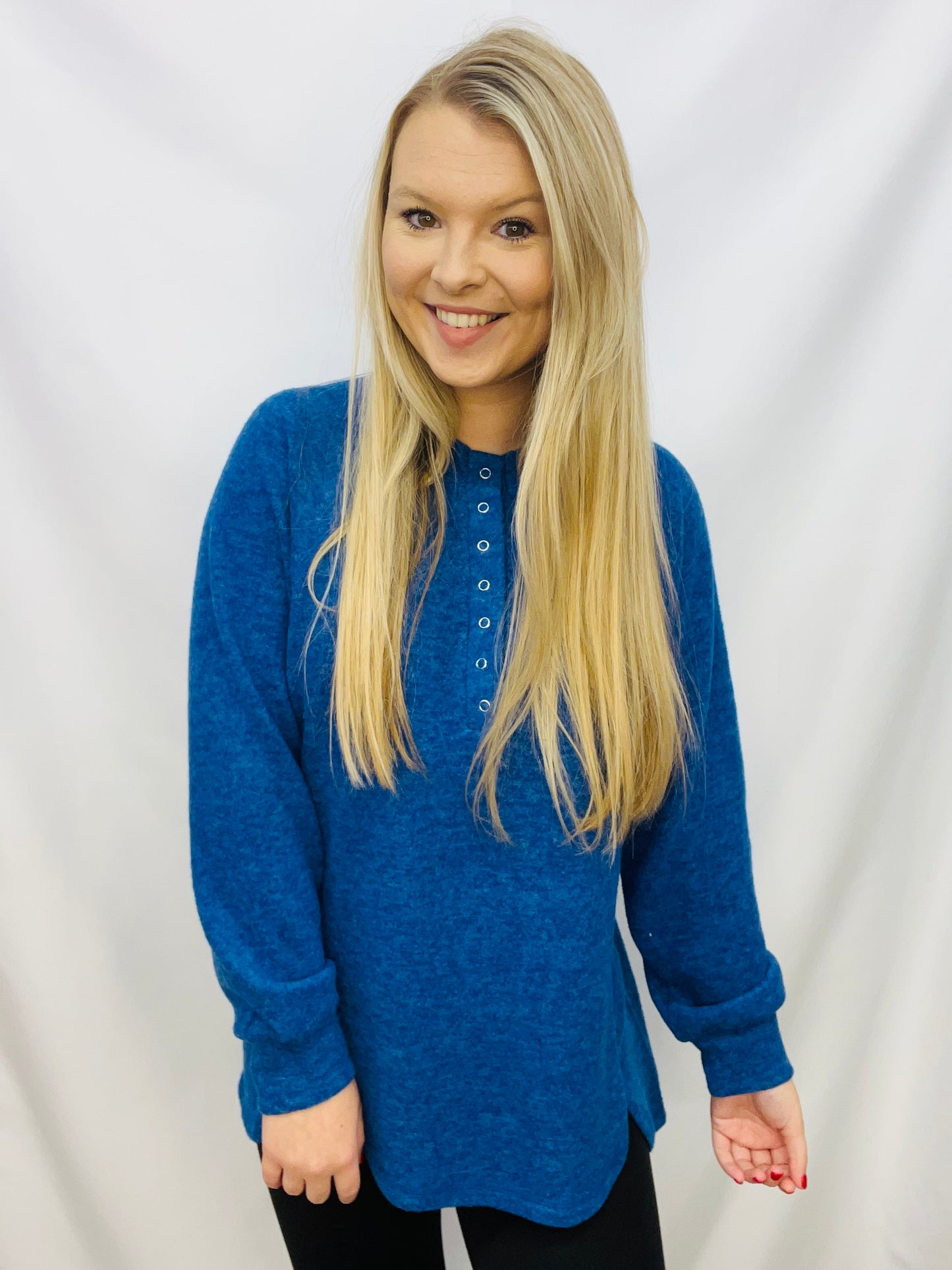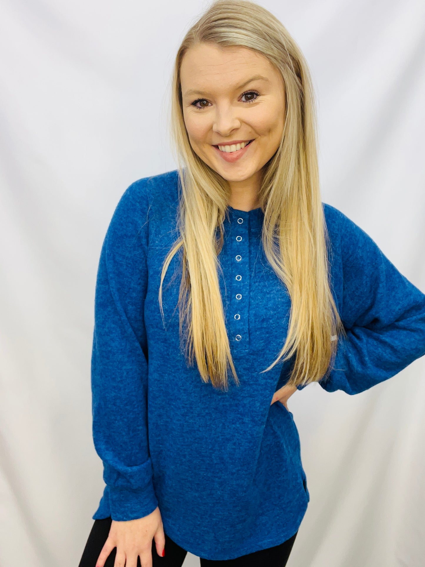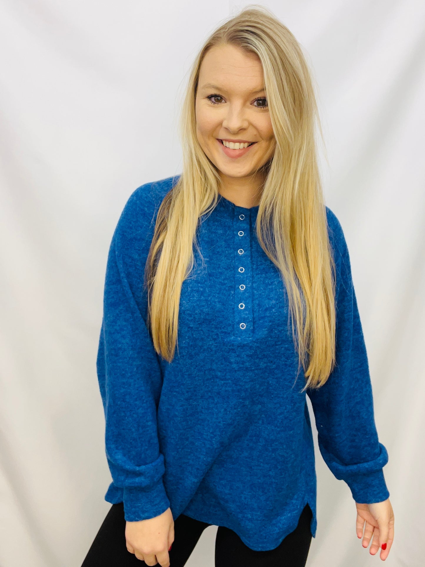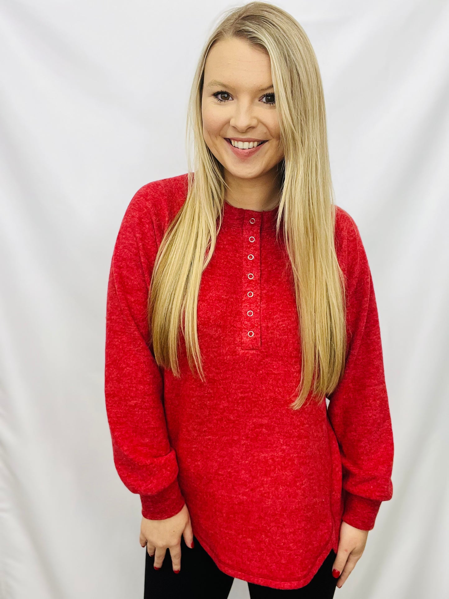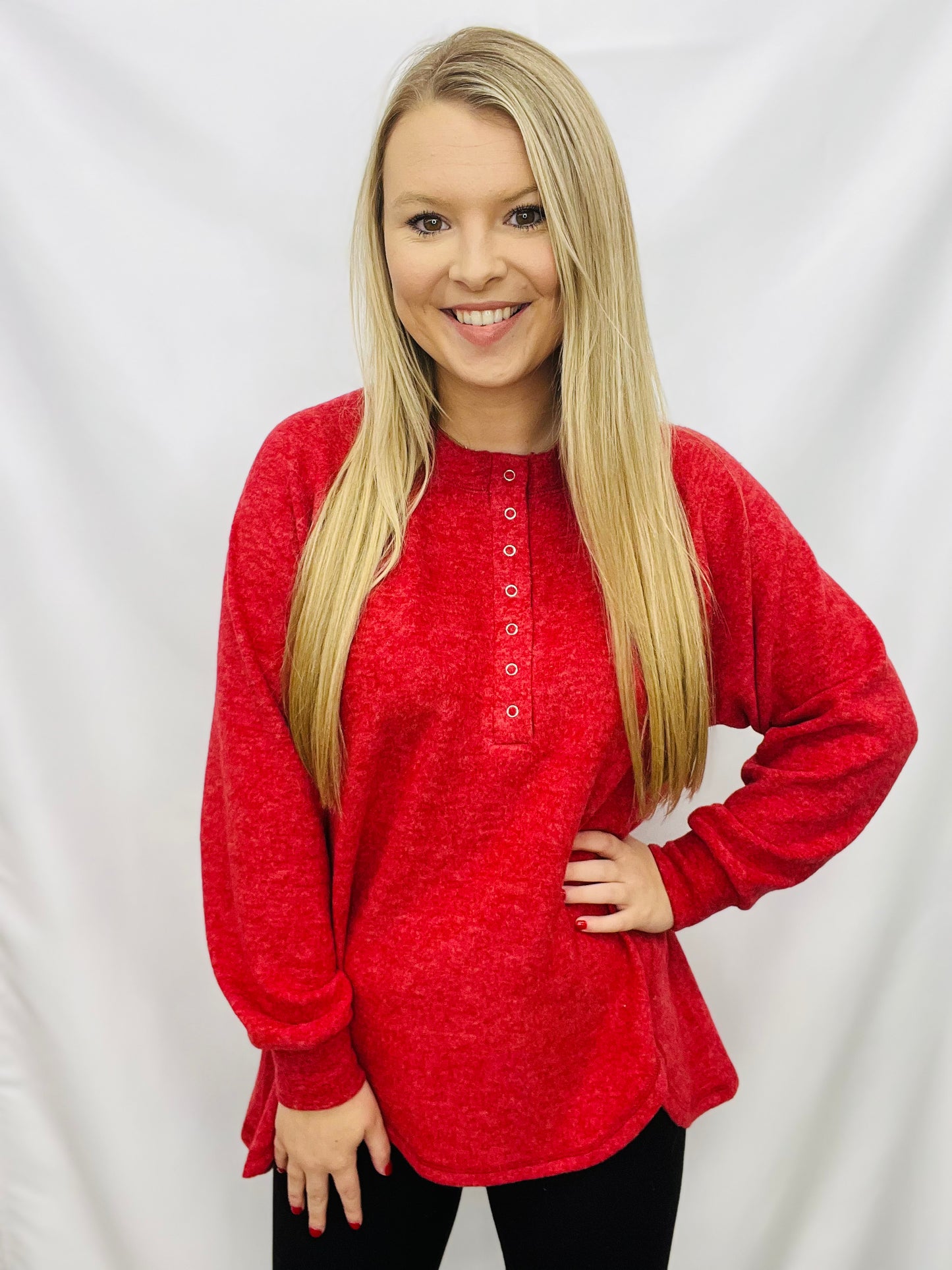 Get the perfect winter look with this comfortable Brushed Melange Hacci Oversized 7-Button Henley Placket Sweater. It features a 7-button Henley placket and a high-low round hem. Enjoy the warmth and stylish winter look.