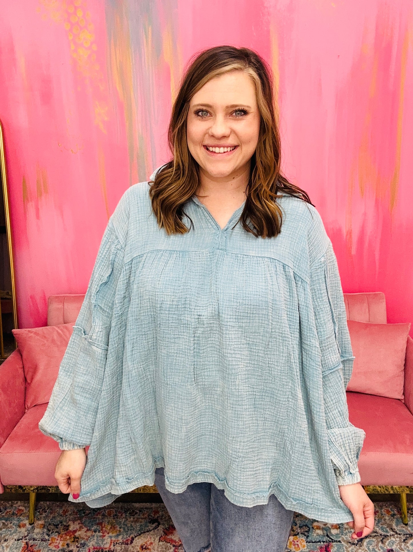 This long sleeve knit top offers a polished look with its notched neckline. It is detailed with exposed stitching for a touch of personality. The solid knit fabric is lightweight and comfortable for day-long wear.