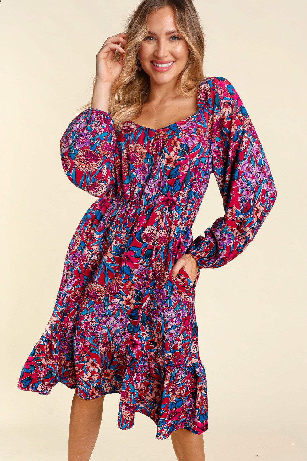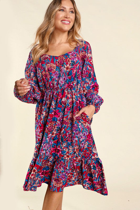 Expertly crafted with an elastic waist and airy fabric, this V-neck dress ensures comfort and flow all day. Featuring a raglan bubble sleeve and a flattering midi length, it also boasts a floral print and ruffle hem for a touch of feminine charm. Side pockets add convenience to this stylish dress.