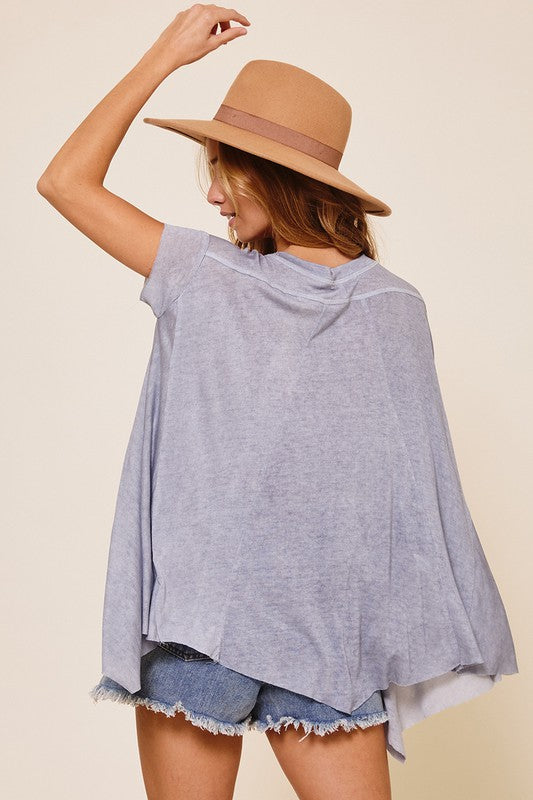 This is a soft knit fabric top. It is a basic casual tee. It is a crew neck with ruffles along the front seam. It is a high low mineral wash top.