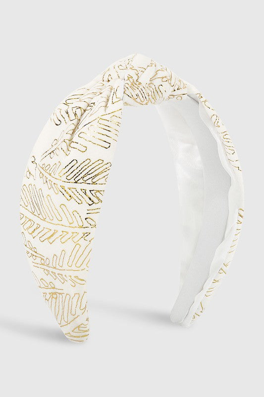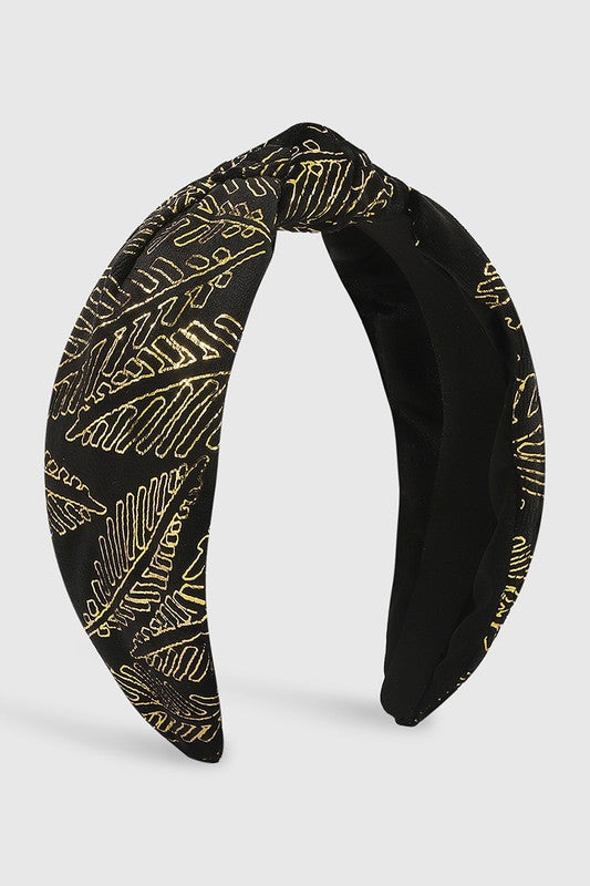 This elegant gold headband is crafted with luxurious velvet and stamped with intricate gold leaf detailing. The knot adds a stylish touch to any outfit. Enjoy all-day comfort with its lightweight design and soft fabric.