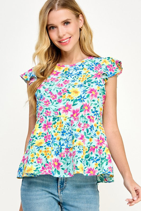 This whimsical and stylish baby doll top features a ruffle cap sleeve, bust darts and tiered design for a flattering and comfortable fit. The intricate multi floral print woven fabric adds a touch of femininity, perfect for any occasion.