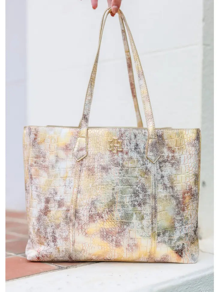 This structured, roomy tote is the perfect on-the-go bag! It features the signature, shiny gold Caroline Hill logo on one side only. This handbag is divided in half by a large, center zippered section. It's easy access open top make it great to find all of your items when you need them. It is lined with a smooth, vegan leather material.