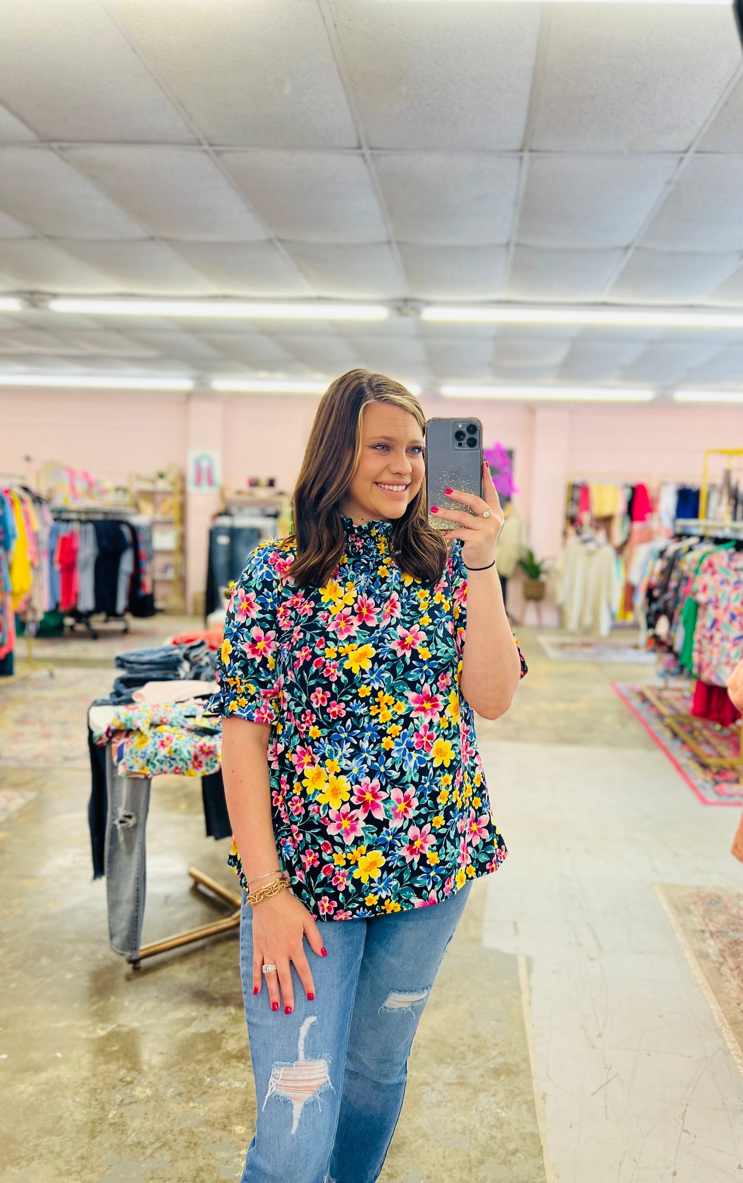 This stylish printed blouse features a ruffled neckline and sleeve top with elastic for a snug fit, puff sleeve and shirring in the shoulder for added comfort. Finished with a pearl button closure on the back, this top is sure to make a fashion statement.
