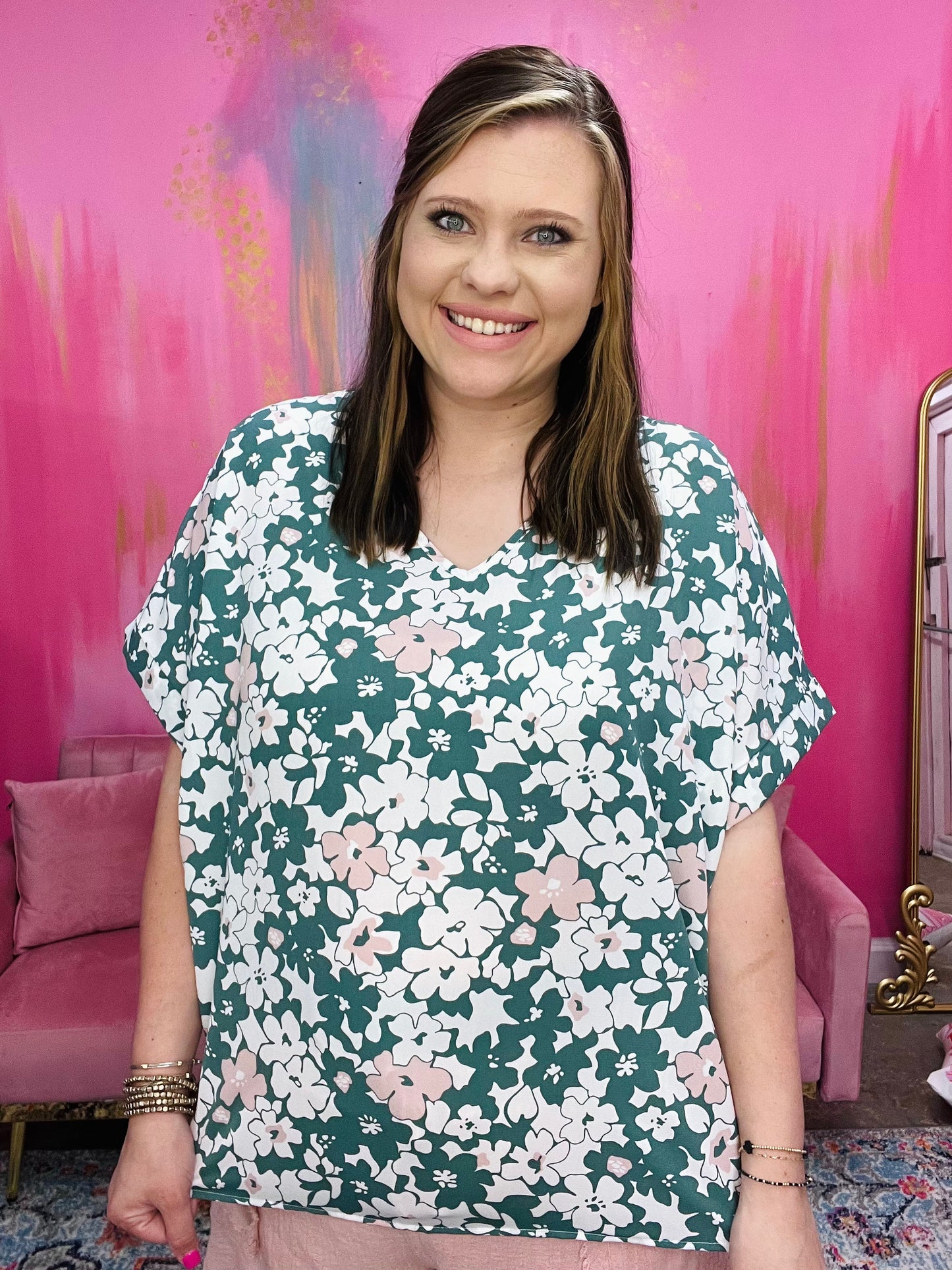 This beautiful floral relaxed V-neck top brings a hint of summer to your wardrobe with its short sleeves and bright pattern. The lightweight fabric creates a comfortable fit perfect for all occasions.