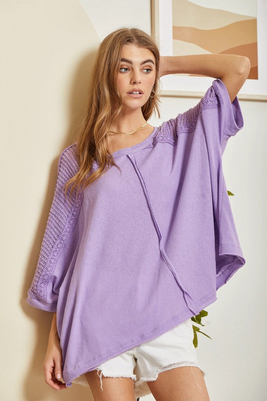 This knitted tunic top offers a relaxed fit for maximum comfort. The crochet contrast sleeves add a touch of elegance, while raw edge details on the front provide a simple and effortless look. Stay comfortable and stylish with this easy fit tunic top.