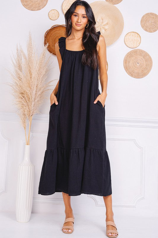 This is a gauze sleeveless dress with ruffle straps.