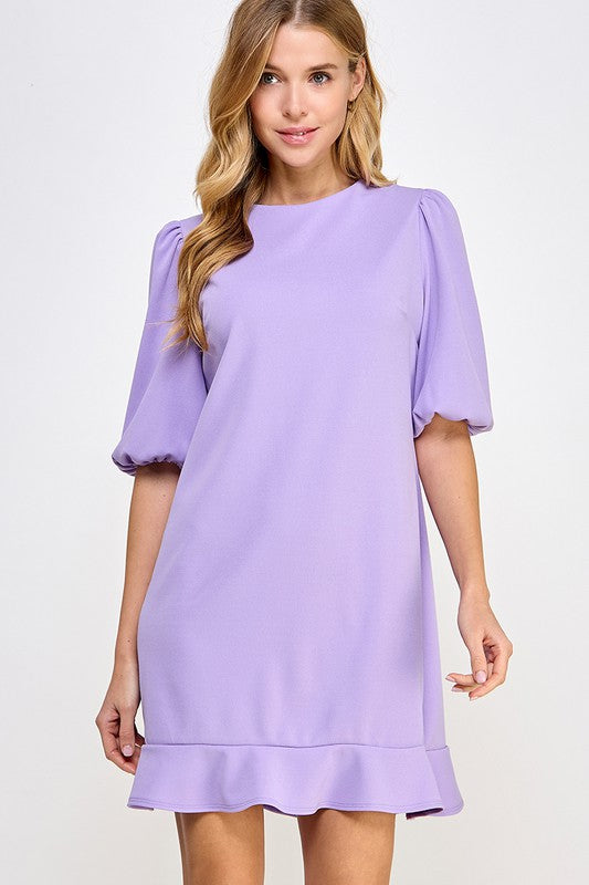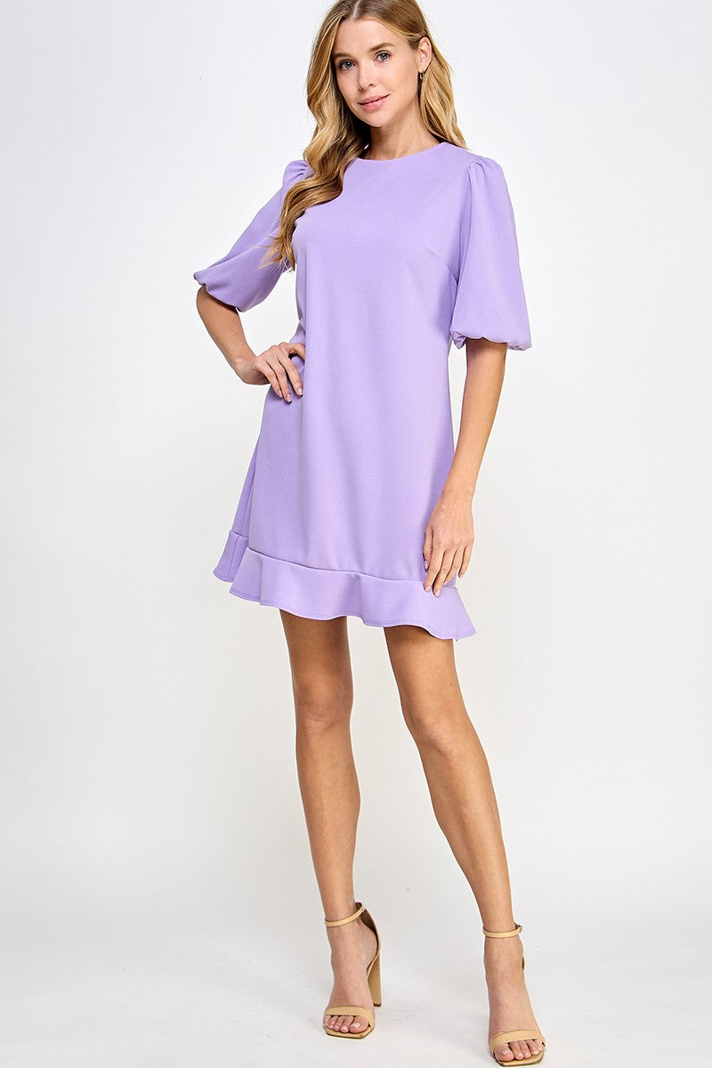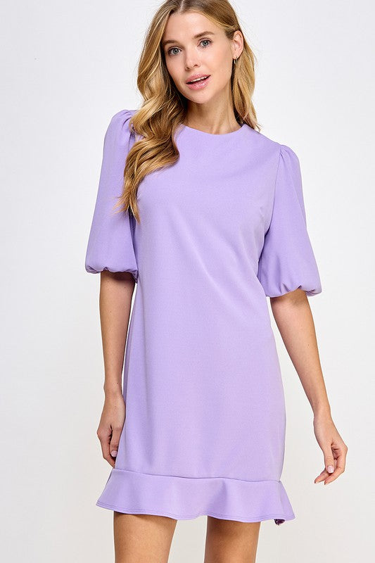 This solid puff sleeve dress features a ruffle hem detail and invisible back zipper closure for a sleek and sophisticated look. The bust darts provide a flattering fit and a touch of elegance. Perfect for any occasion, this dress is a must-have in any wardrobe.