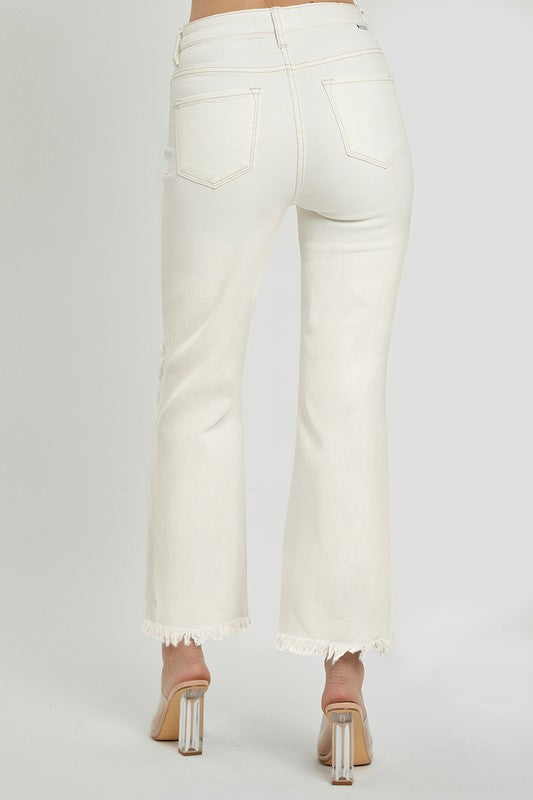 Our HIGH RISE KNEE DISTRESSED STRAIGHT PANTS offer a comfortable fit. They are made from a high quality blend of cotton and spandex, making them both breathable and stretchable. The pants have a straight cut and a high-rise waist for a more contemporary look. With a distressed look, these pants add edginess and style to any outfit.
