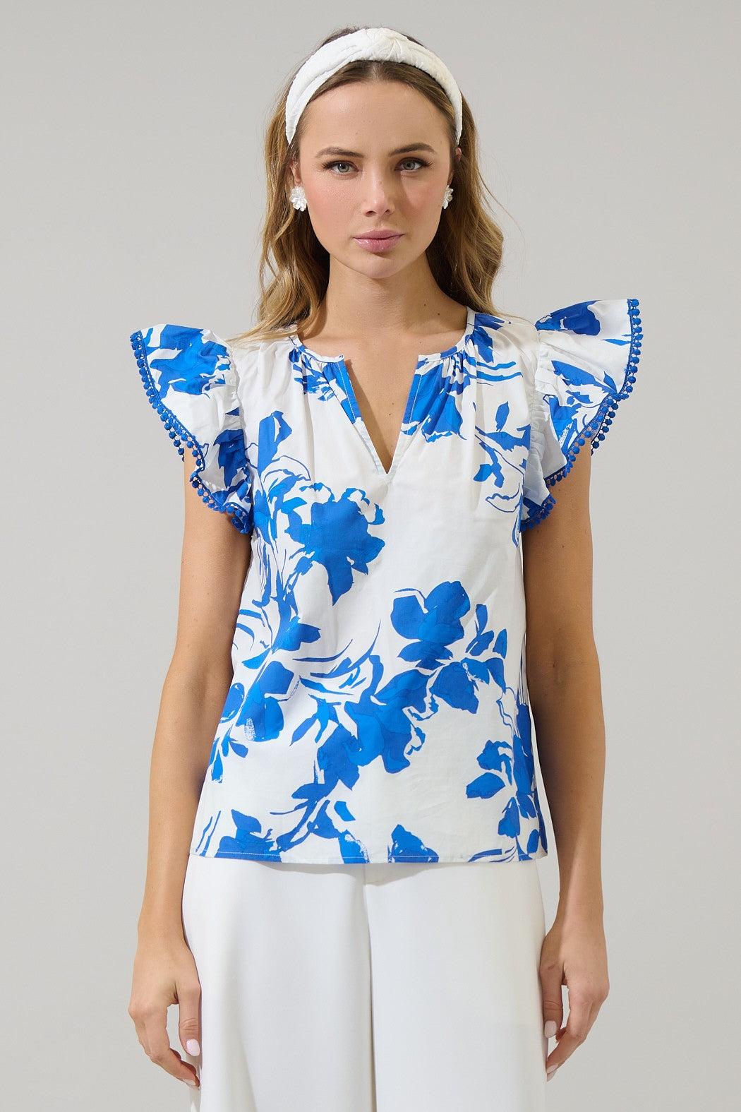 Snap a picture-perfect moment in this cute poplin top. This effortless poplin top features short flounce cap sleeves with pom pom trim around. It has a split neckline and maintains classic fit. Pair it with denim jeans and white heels to match the top.