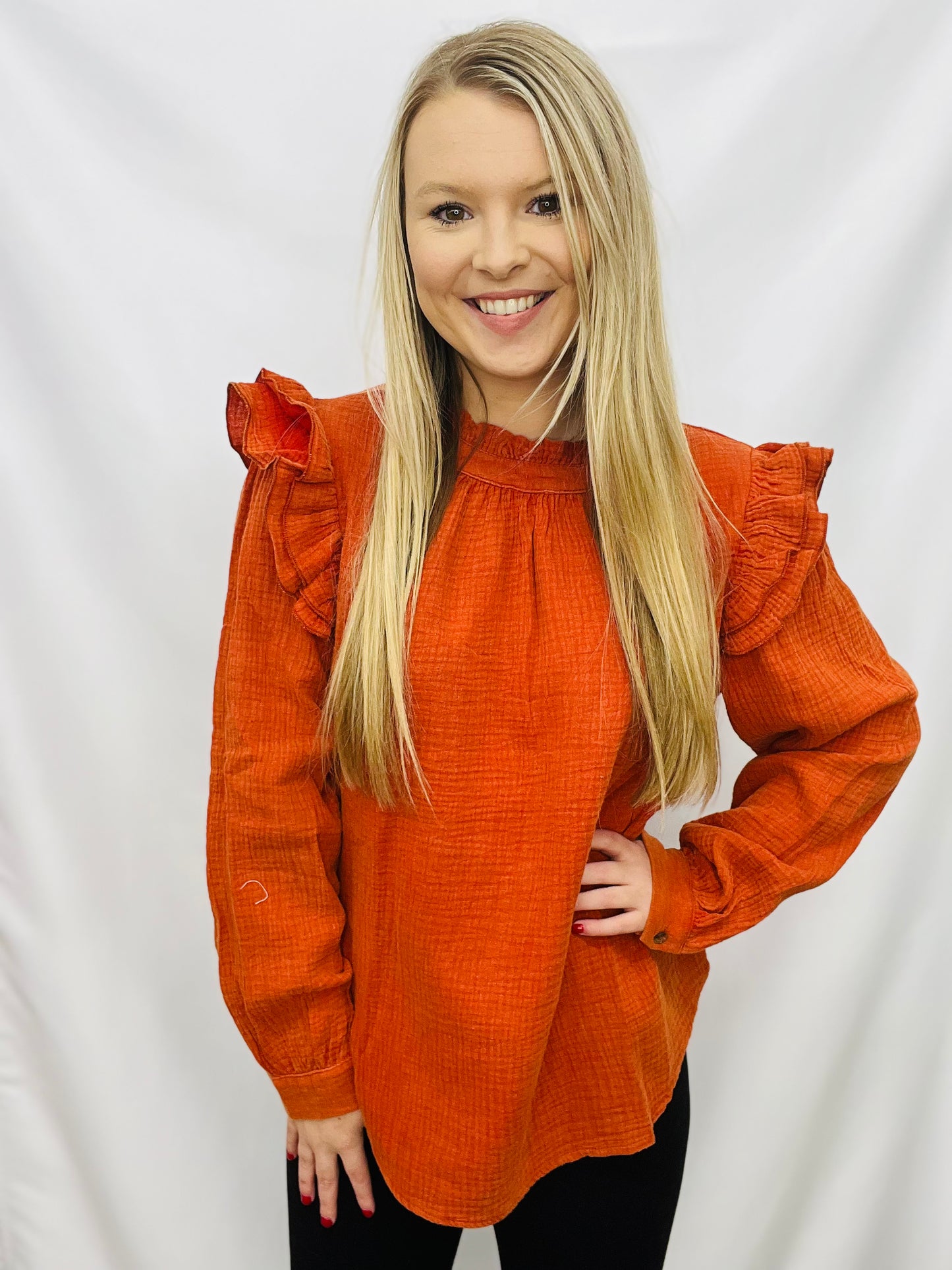 This top runs smaller. I suggest going up a size. This top offers superior comfort and breathability due to its lightweight cotton mineral wash fabric. The ruffled detail and hemline give it a unique, modern feel, while the long sleeves provide coverage. Smooth and soft to the touch, this top is perfect for a casual day out.