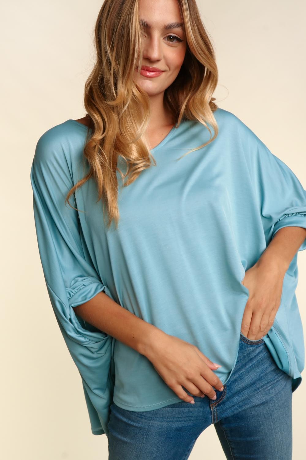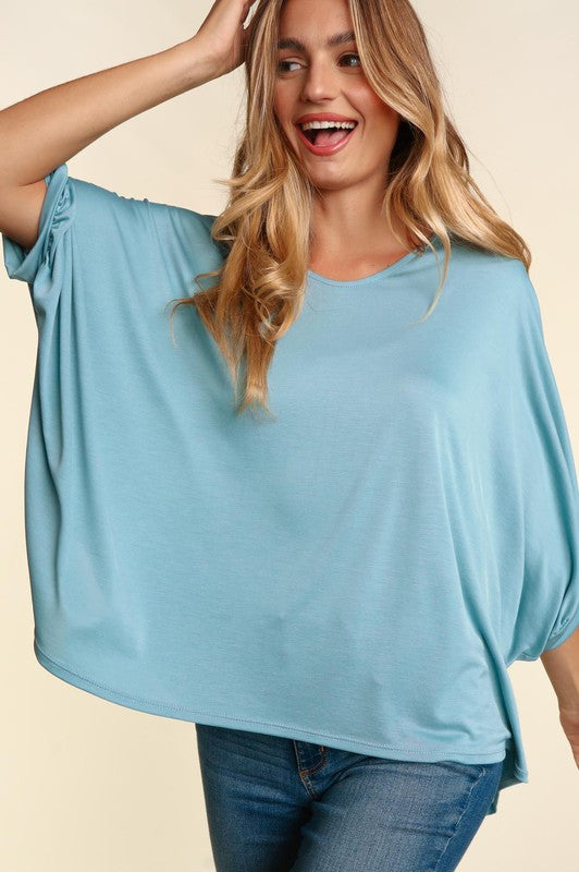 Maximize your comfort and style with our Rounded V Neck Dolman Bubble Sleeve Top. Featuring a loose oversized fit, this slouchy top is made from a soft and breathable modal knit fabric. The rounded V neck and elbow-length bubble sleeves add a chic touch to this wardrobe essential.