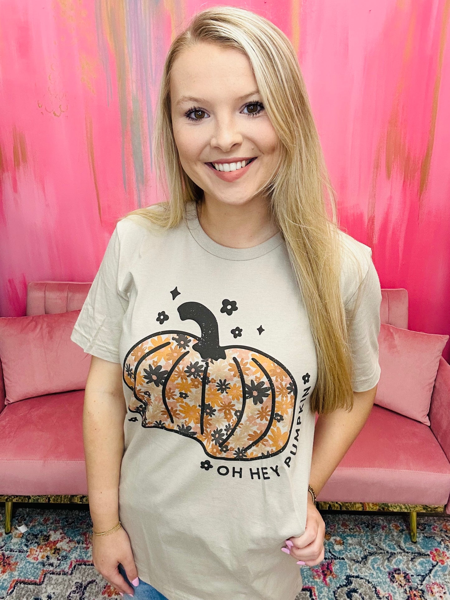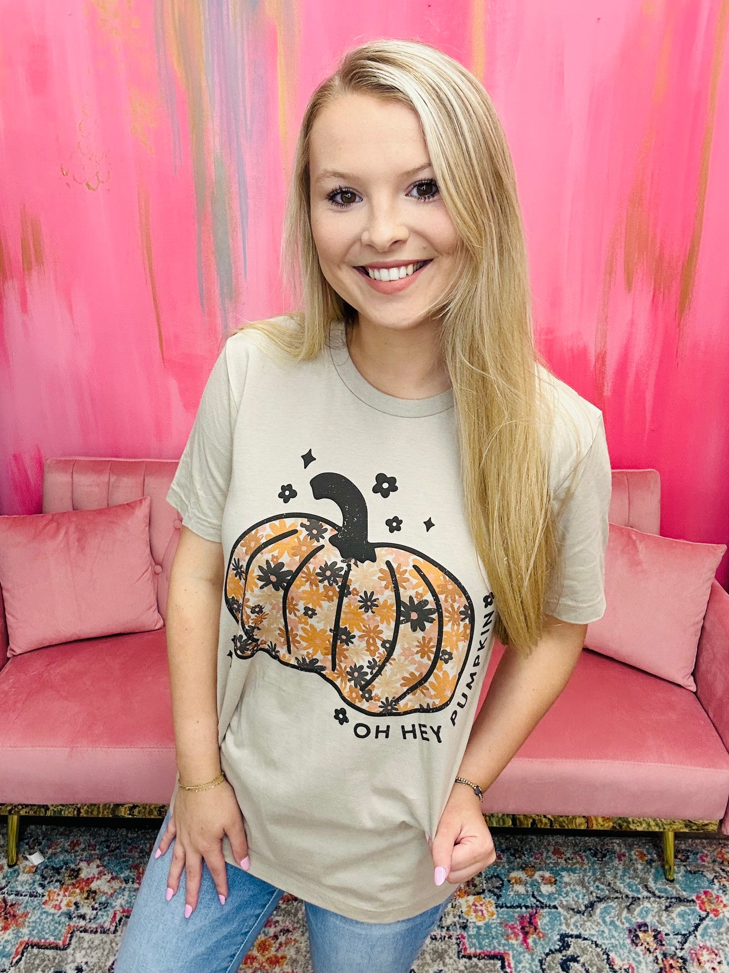 This OH HEY PUMPKIN GRAPHIC TEE is a must-have for fall. Crafted with 100% cotton, this tee is incredibly soft and comfortable. A fun graphic print adds a touch of fun, perfect for expressing your pumpkin-filled joy this spooky season. Add a classic style to your wardrobe with this stylish and comfortable tee.