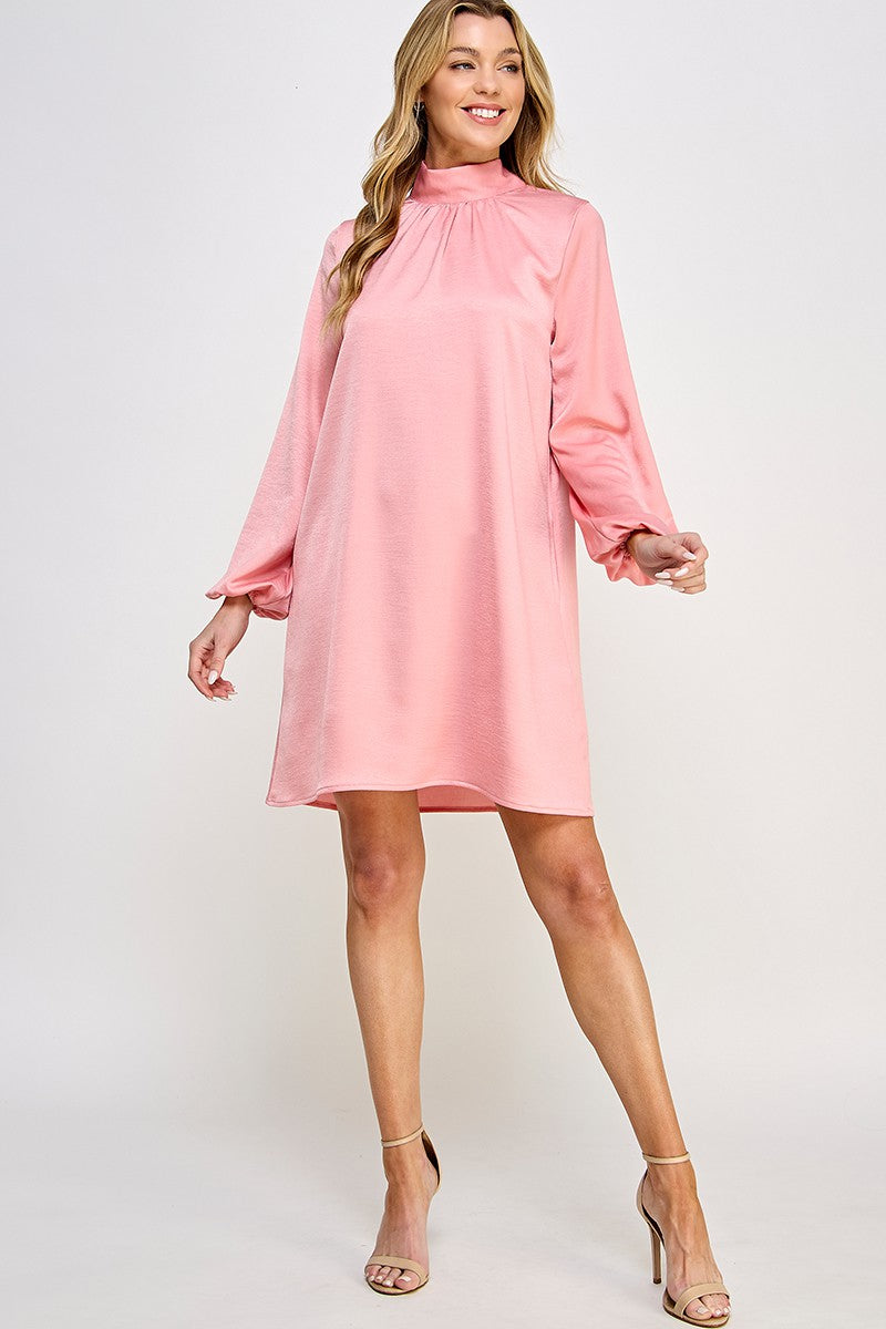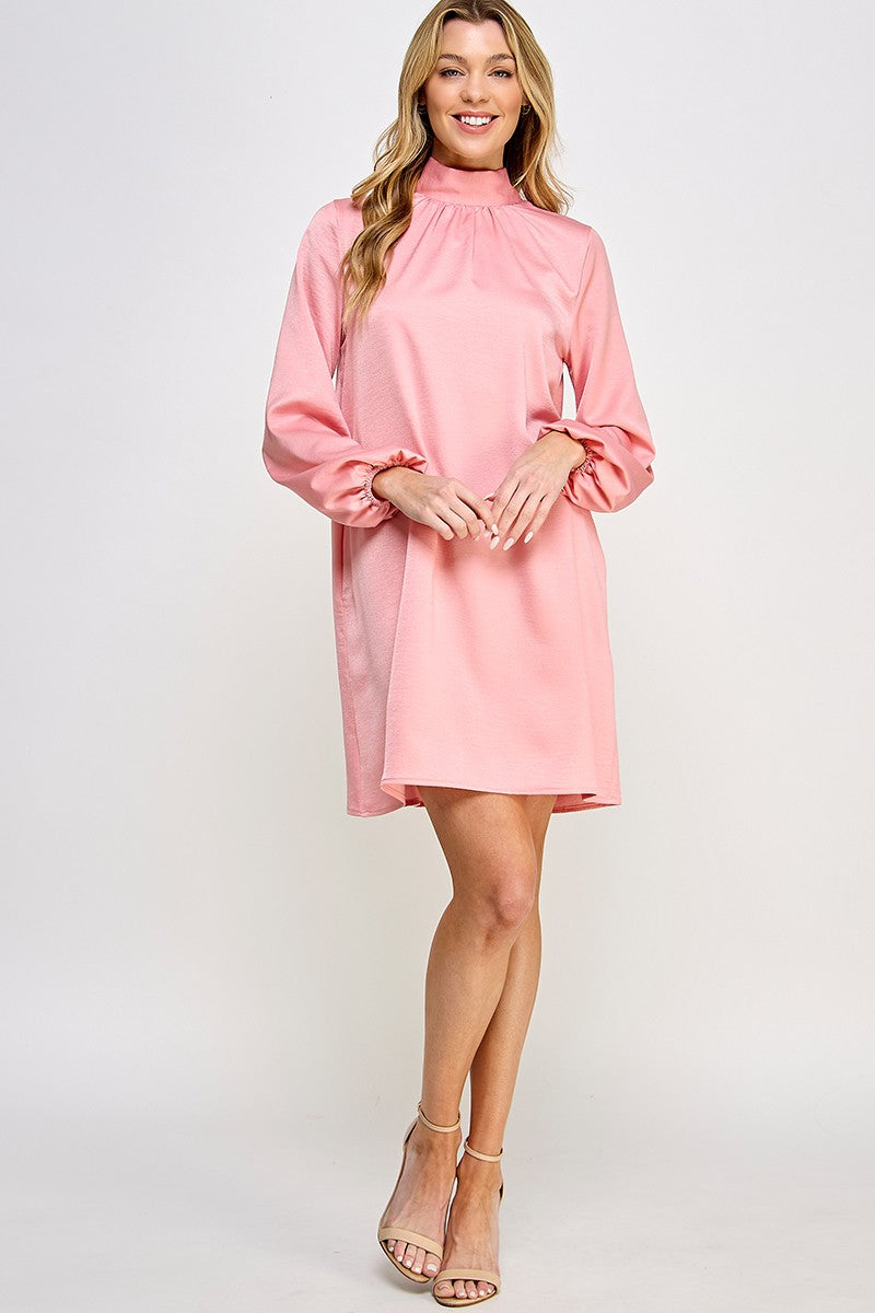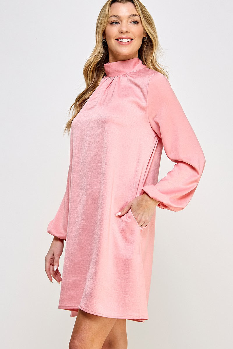 This solid satin long sleeve shift dress not only offers a sleek and polished look, but also includes adjustable back ties for added comfort. With shirring detail along the front neckline, this dress is both stylish and practical, featuring hidden side pockets and elastic in the sleeves. Perfect for any occasion.
