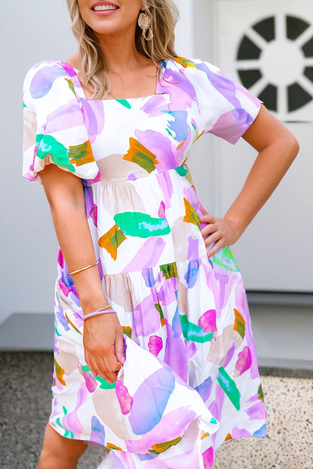 Add a modern, artistic vibe to your wardrobe with our printed dress. The stylish puff sleeves add a trendy, feminine touch while the comfortable smocked back ensures a flattering fit. Experience the fusion of artful prints, trendy sleeves, and effortless elegance in one stunning piece.