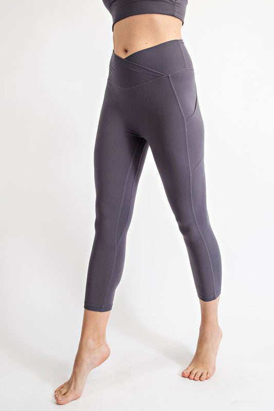 Butter Yoga Fabric, Capri Length - V shaped Waist band with Side Pockets and High Waist. Model is 5'10" and wearing size Small. Fabric 84% Poly Microfiber, 16% Spandex.