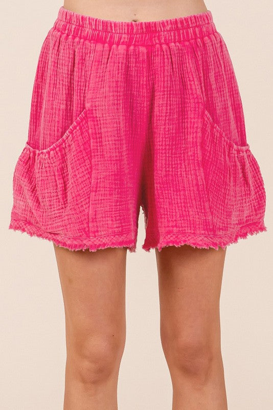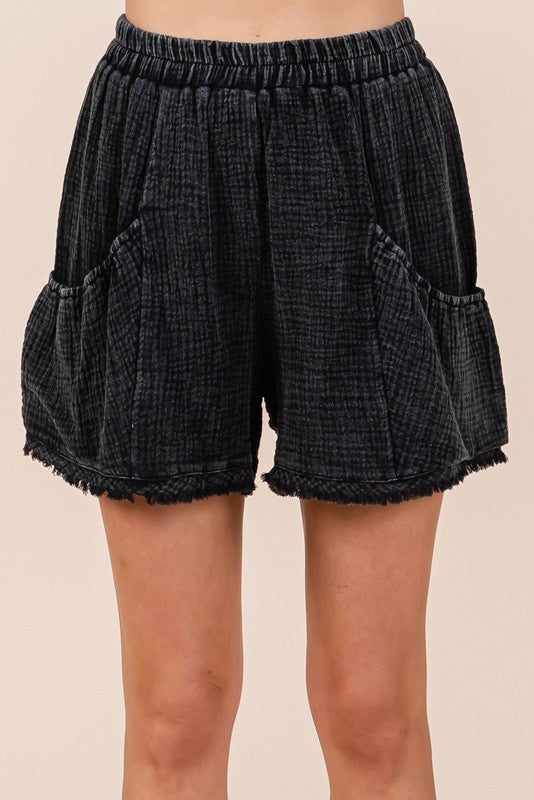 Upgrade your summer wardrobe with our textured washed shorts. These stylish shorts feature a stretch-band waistline, front pockets, and a frayed hemline for a modern look. Made from non-sheer, lightweight fabric, these shorts are perfect for any warm-weather occasion. Stay comfortable and chic with these versatile shorts.