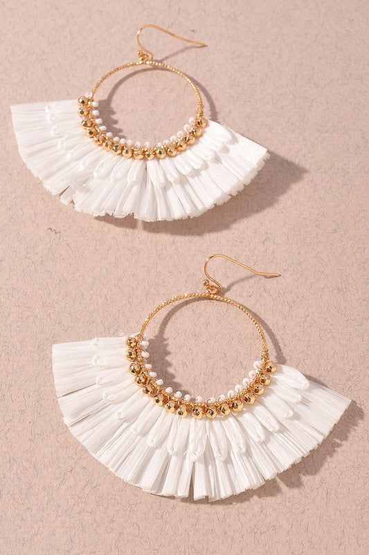 These earrings feature a modern and unique design with a round circle dangle and raffia fan. They are lightweight and crafted from high-quality materials that are built to last. They are the perfect accessory to add a playful touch to any outfit!