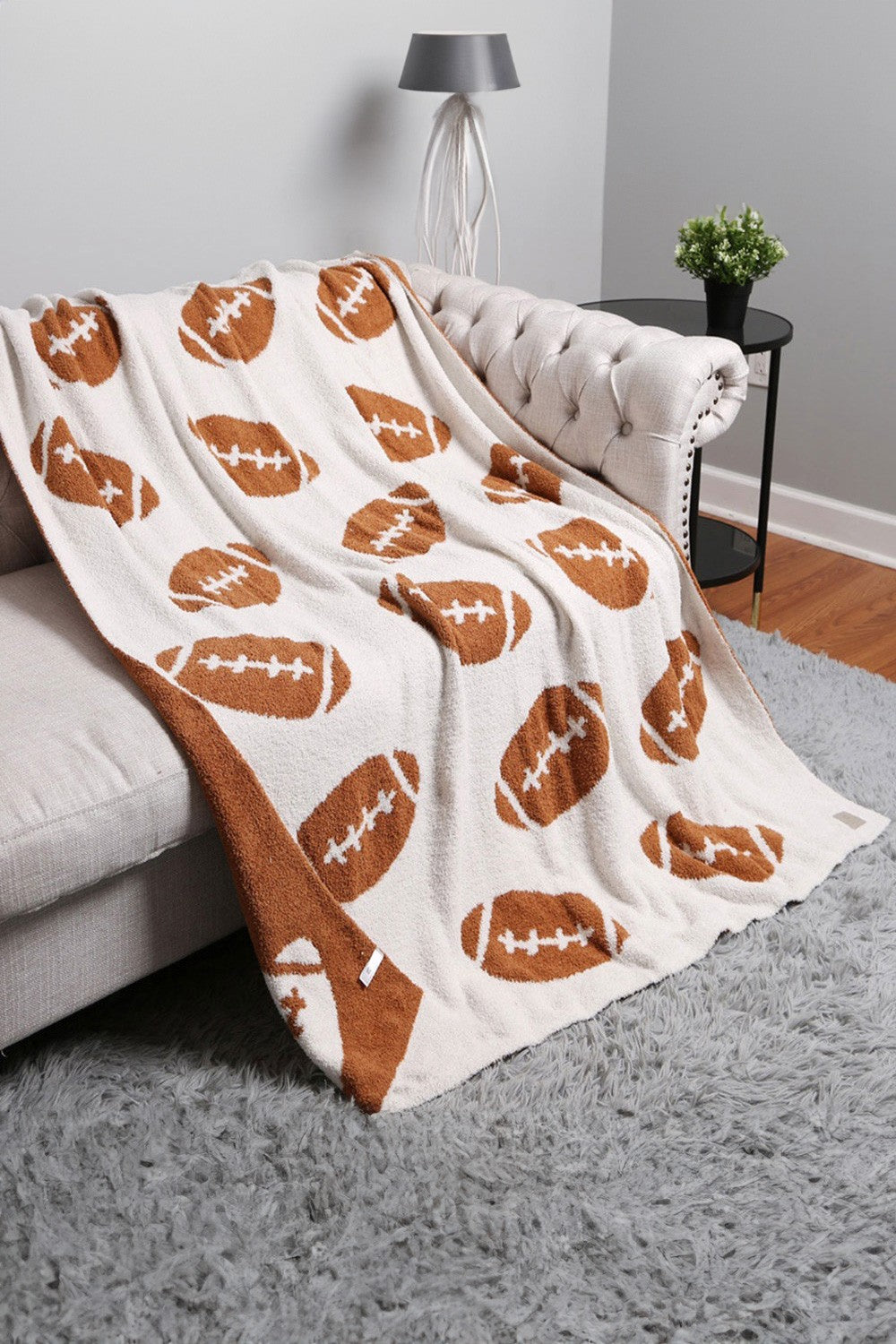 Our reversible football-patterned throw blanket is perfect for watching games, cuddling up on the couch, or for adding warmth to any room. It is made of 100% poly microfiber and measures 50" x 60". This throw is machine washable and can be air dried or tumble dried. Enjoy the softness and convenience of this reversible blanket all year round.