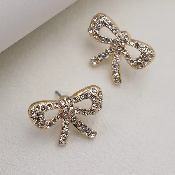 Add a touch of elegance to your look with our dainty bow earrings, featuring meticulously arranged rhinestones. With a length of .75" and width of .5", these gold plated earrings are lead and nickel compliant and have a double E-coating for anti-tarnish protection. Elevate your style with a hint of glamour.