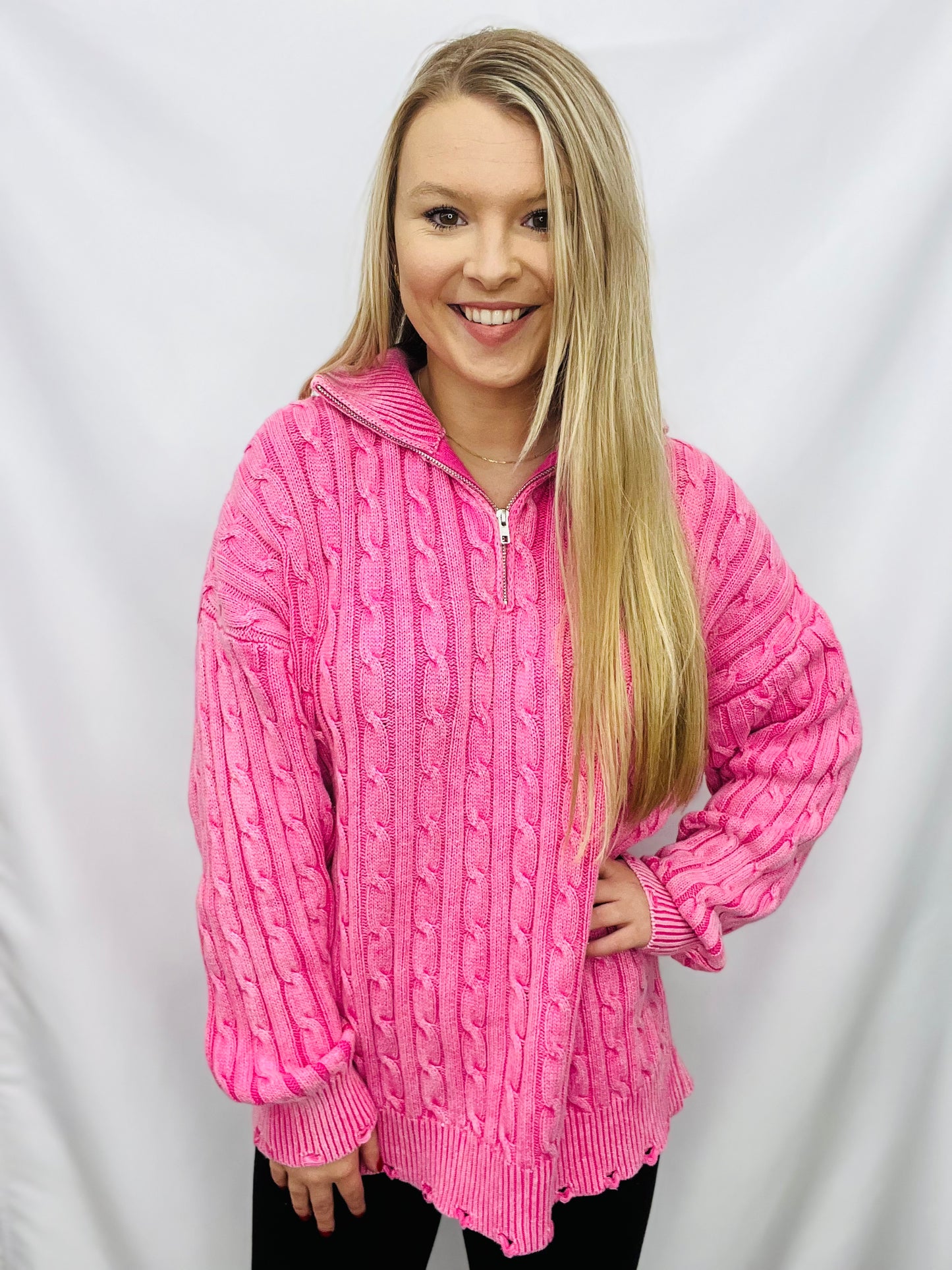 This lightweight cable knit zip-up long sleeve sweater is made from mineral-washed fabric, giving it a unique soft texture and long-lasting quality. The garment features a zipper closure and ribbed trim for a comfortable fit. Perfect for everyday wear.