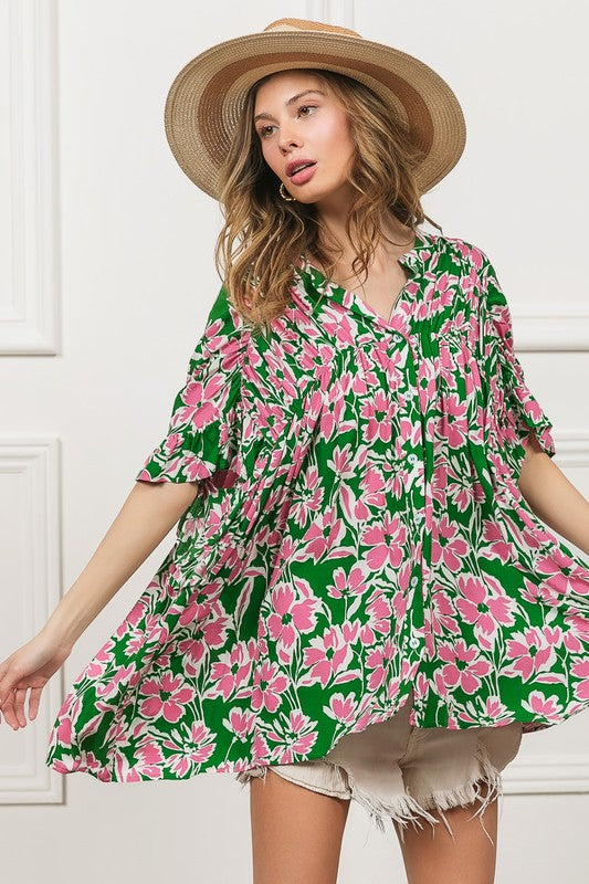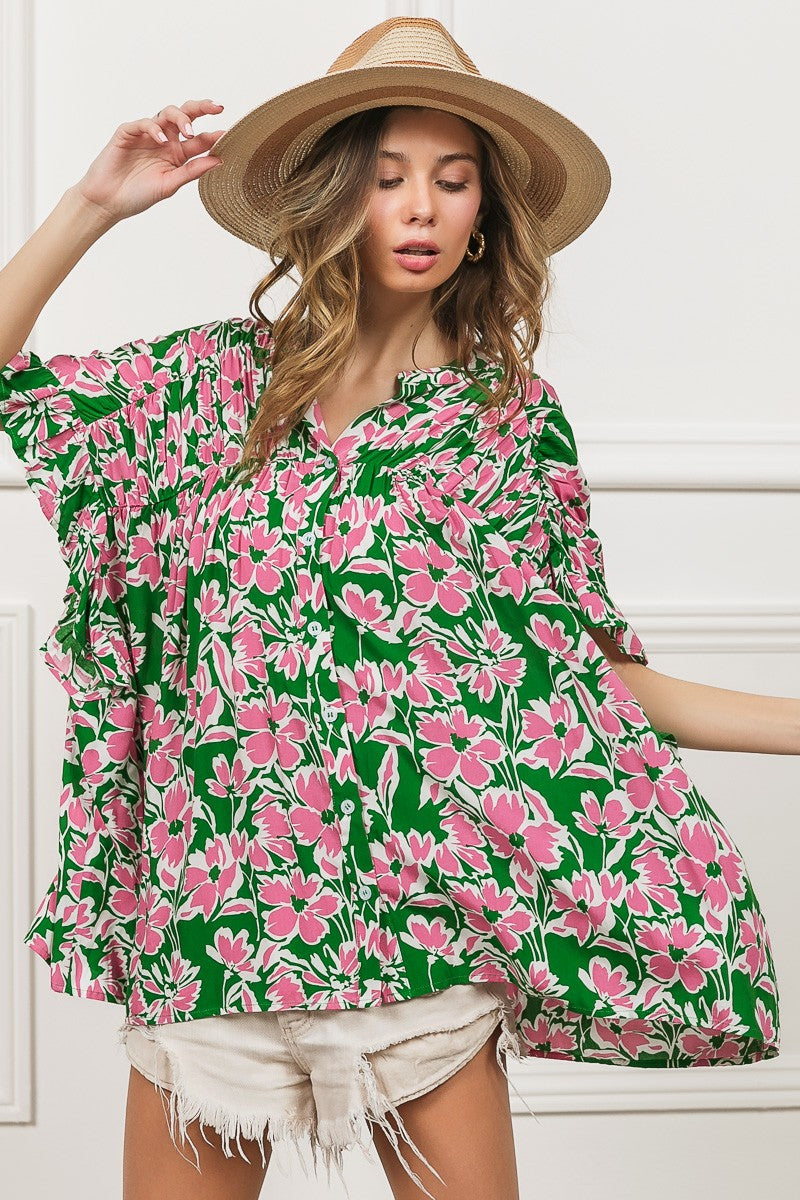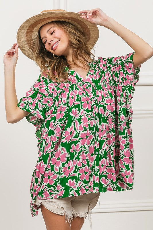 Introducing our Floral Print Buttoned Up Shirred Blouse with Flutter Sleeve - the perfect addition to any wardrobe. Made with a delicate floral print and featuring flutter sleeves, this blouse offers a touch of femininity and style. The button-up design and shirred detailing provide a comfortable fit, making it ideal for everyday wear.