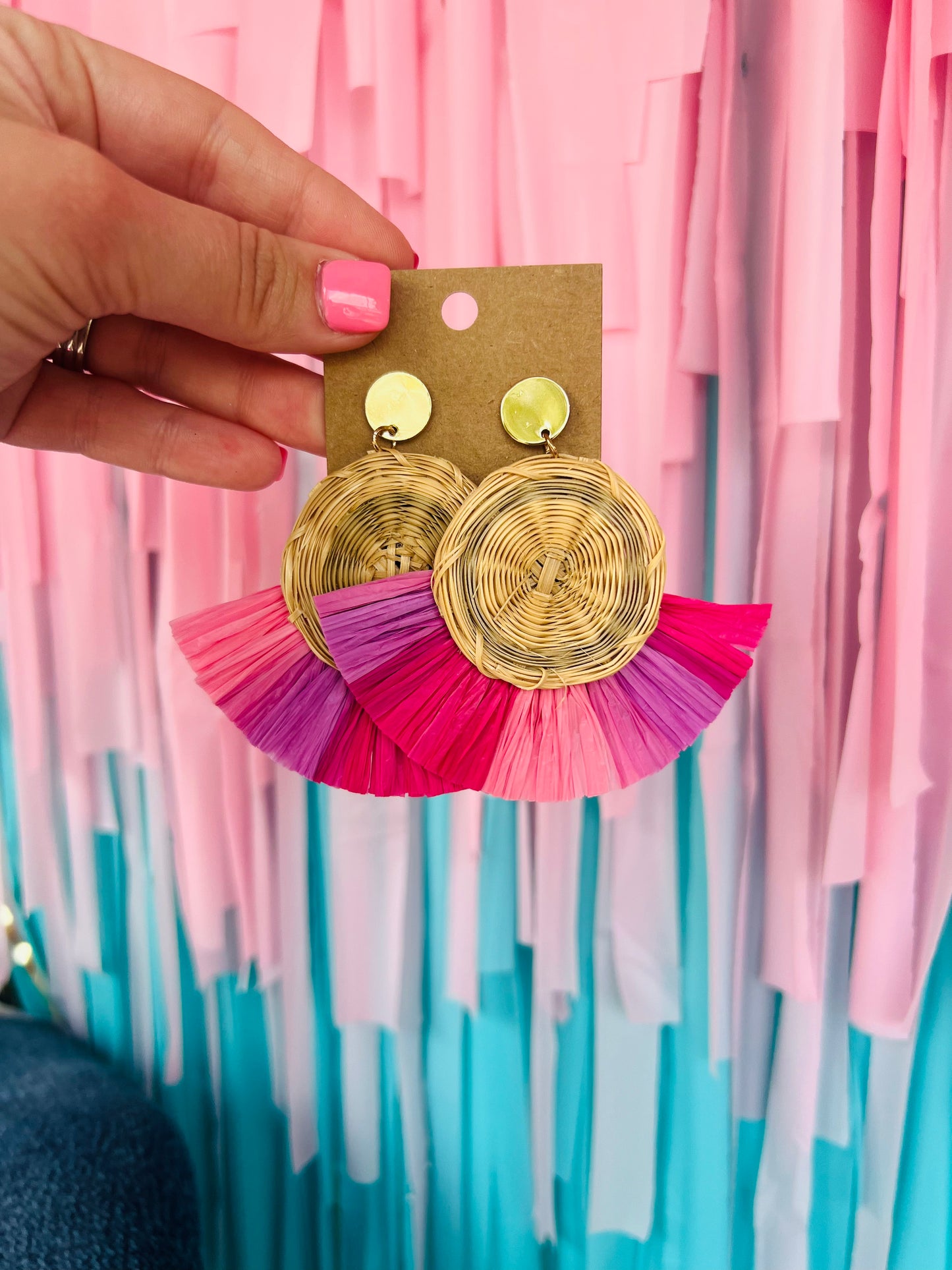 STRAW DISC RAFFIA FRINGE EARRINGS