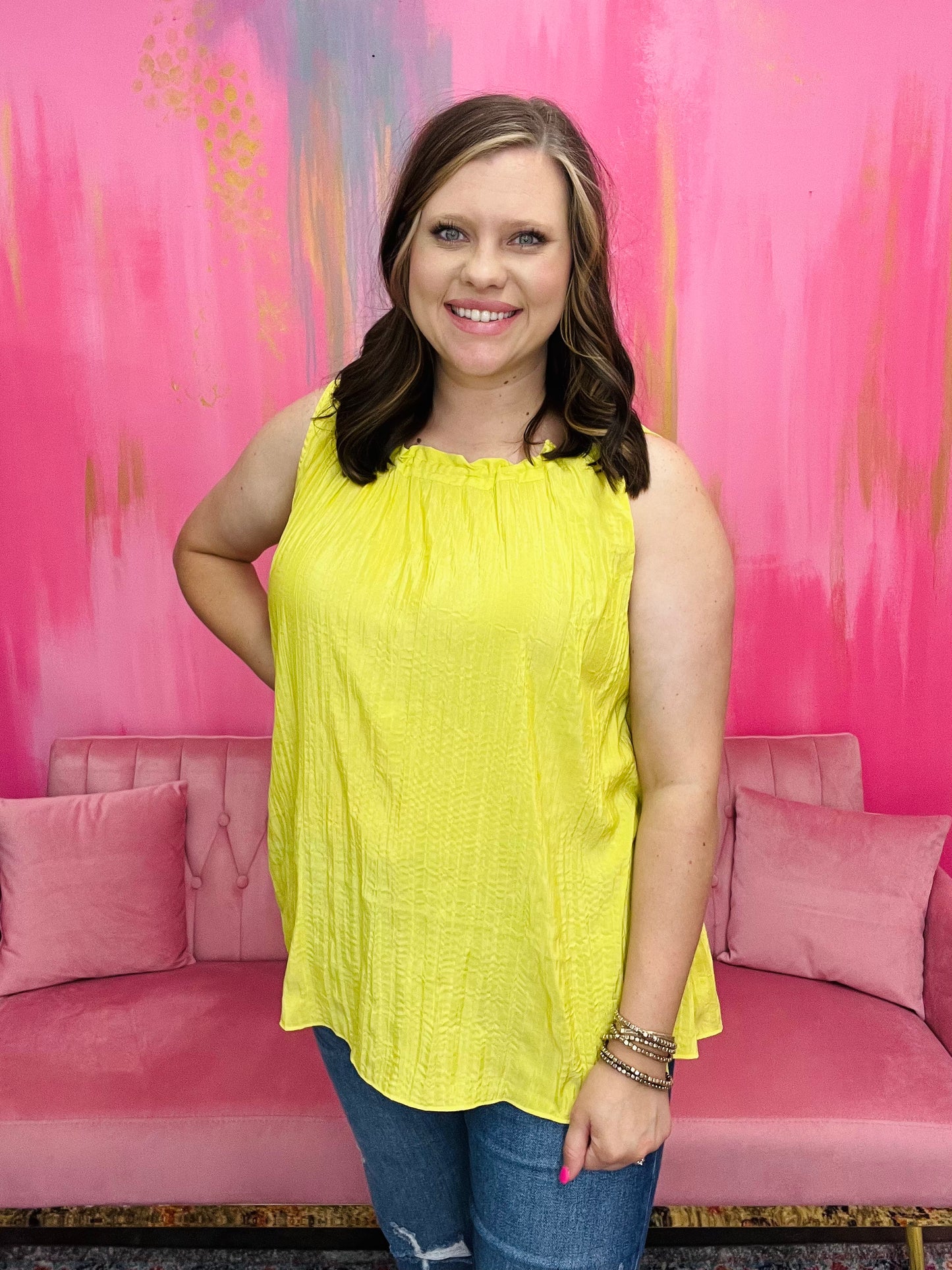 This stylish top is crafted from a crinkle satin effect fabric for a unique look. The adjustable self-spaghetti neckline and turned-tied back design provide an adjustable fit. With its sleeveless design, this top is perfect for the warmer days.
