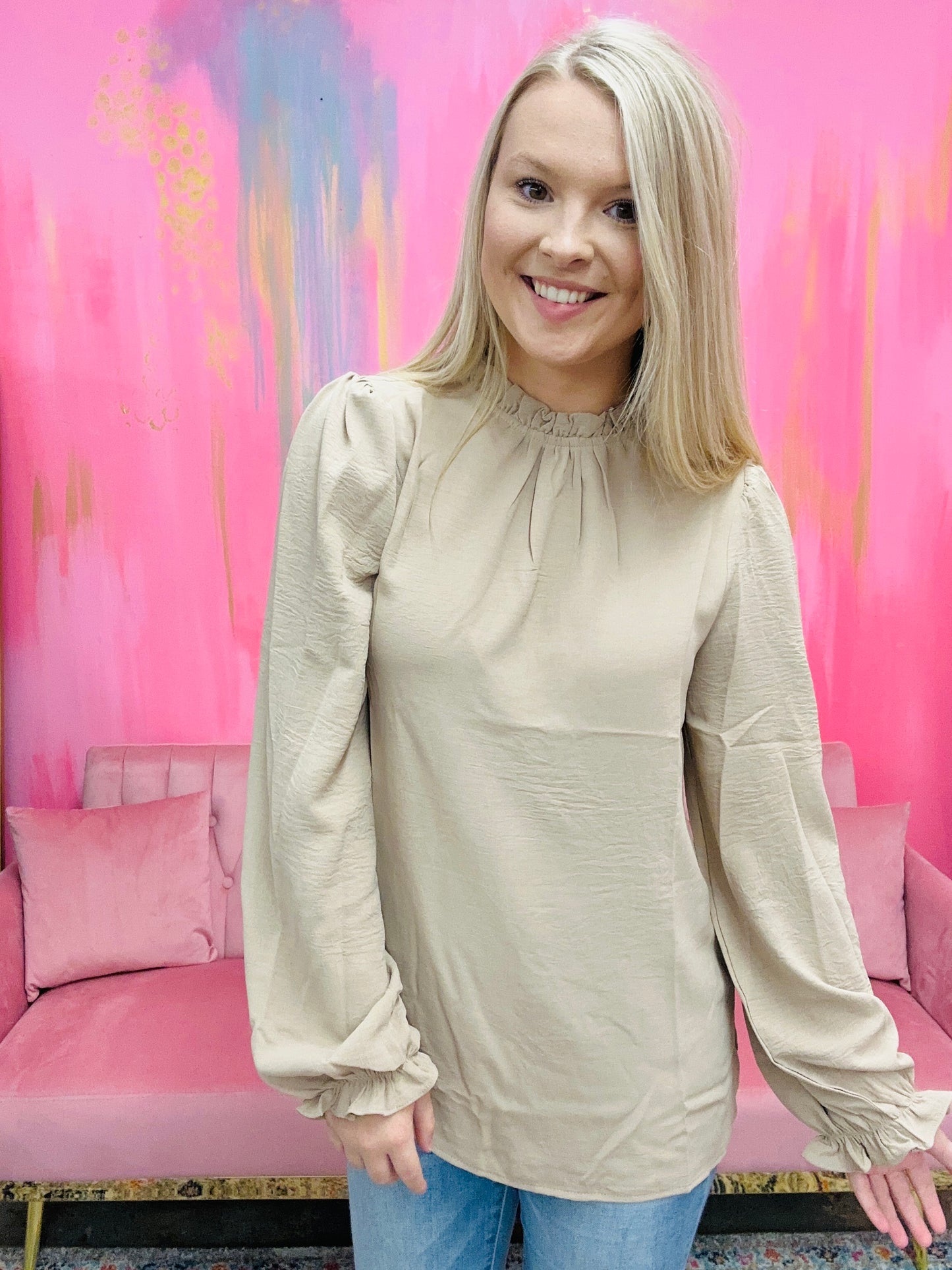 A fashion essential for any closet, this SOLID MOCK NECK WITH RUFFLE LONG SLEEVE BLOUSE features a classic keyhole button back. Crafted from lightweight material for all-day comfort, this blouse is perfect for any occasion.