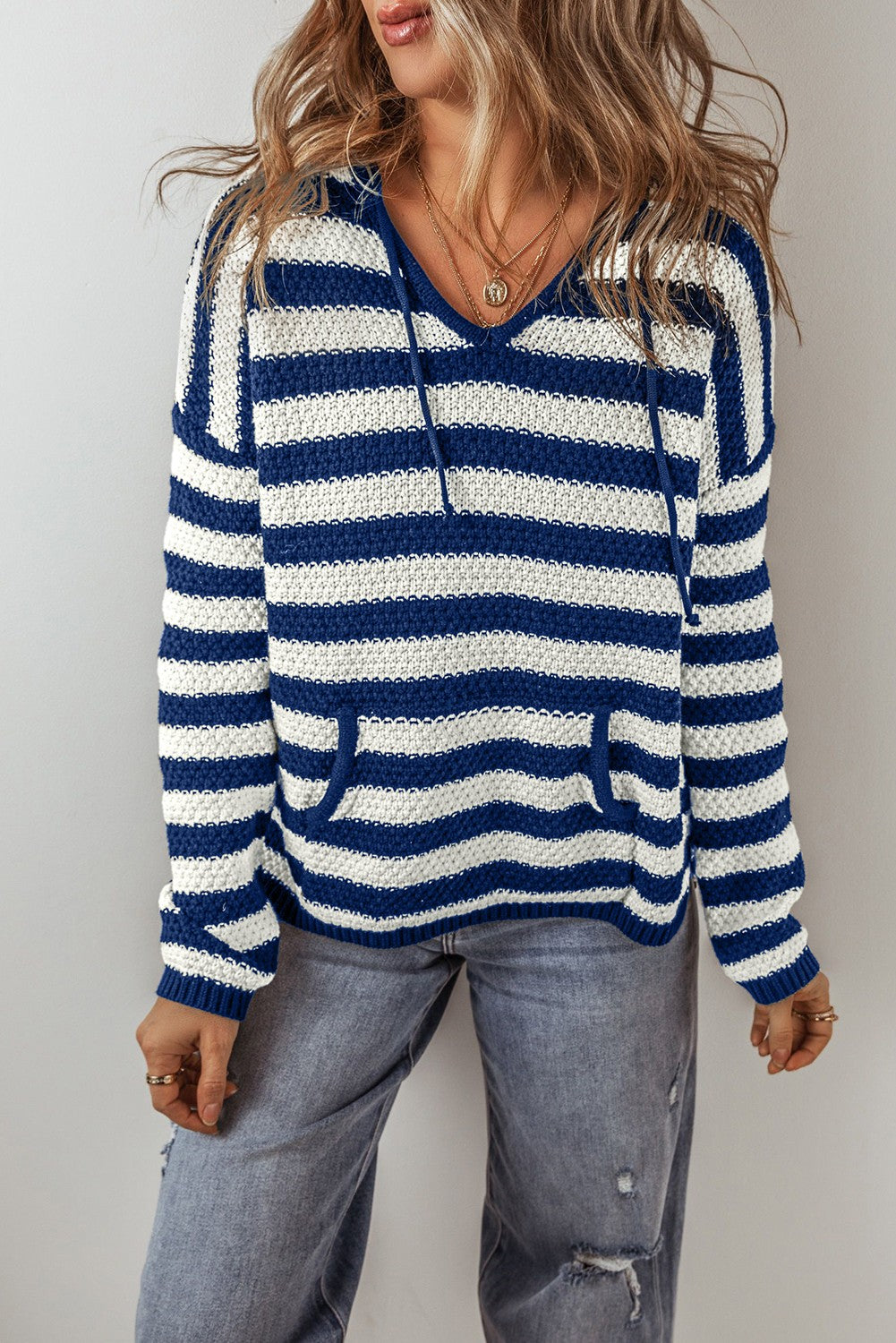 Stay warm and stylish with our Stripe V Neck Pocketed Drawstring Hooded Sweater. Made with high-quality materials, this sweater features a flattering v-neckline, convenient pockets, and an adjustable drawstring hood. Perfect for any occasion, you'll love the comfort and versatility of this must-have wardrobe staple.