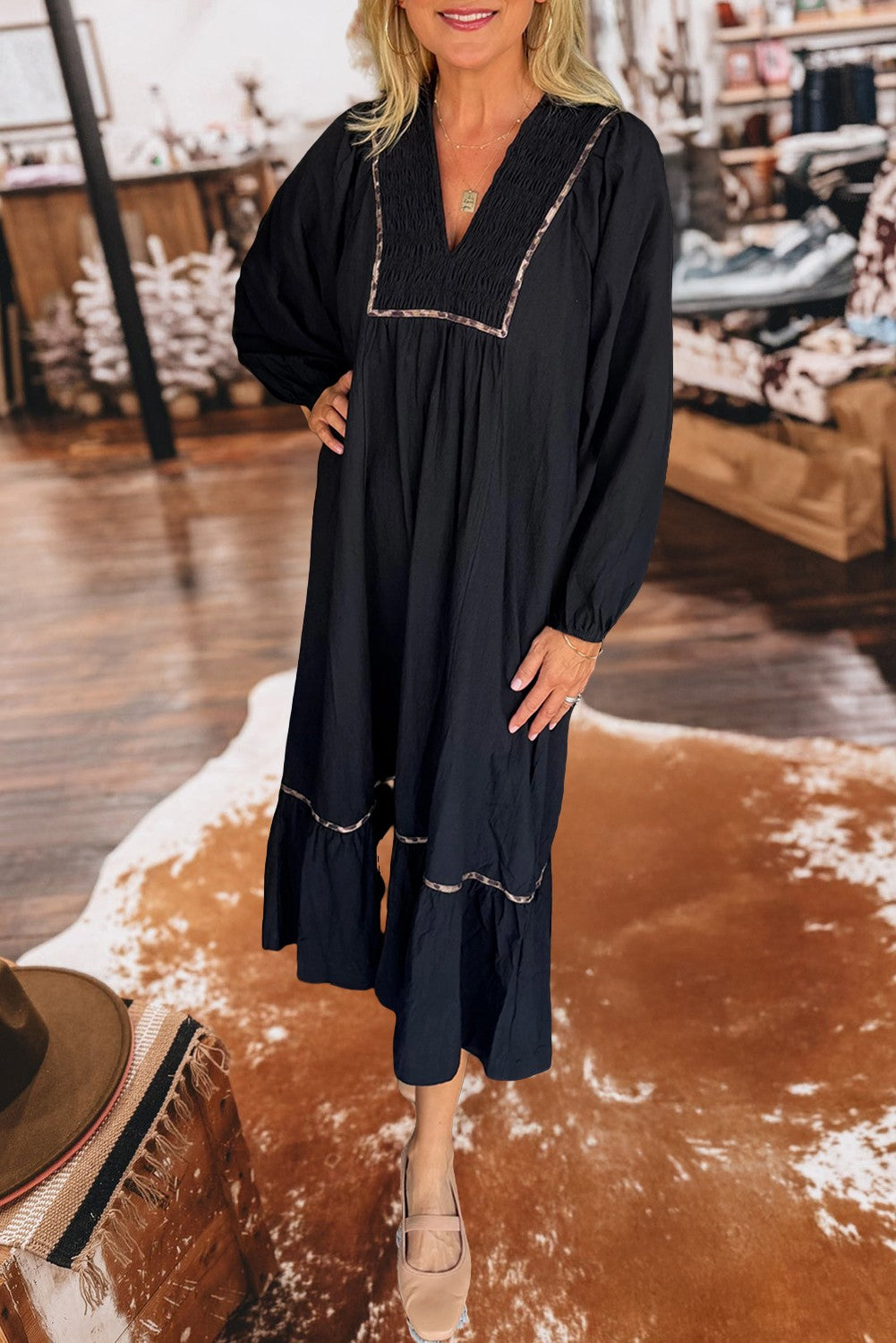 This elegant V-neck dress features sophisticated smocked detailing and a striking leopard print trim for a contemporary edge. The smocked waistline enhances your silhouette, while puff sleeves introduce a refined yet playful element. Crafted from premium materials, this long dress ensures comfort without sacrificing style, making it an ideal choice for formal events or chic casual outings. Elevate your wardrobe with this versatile piece that blends timeless design with modern flair.