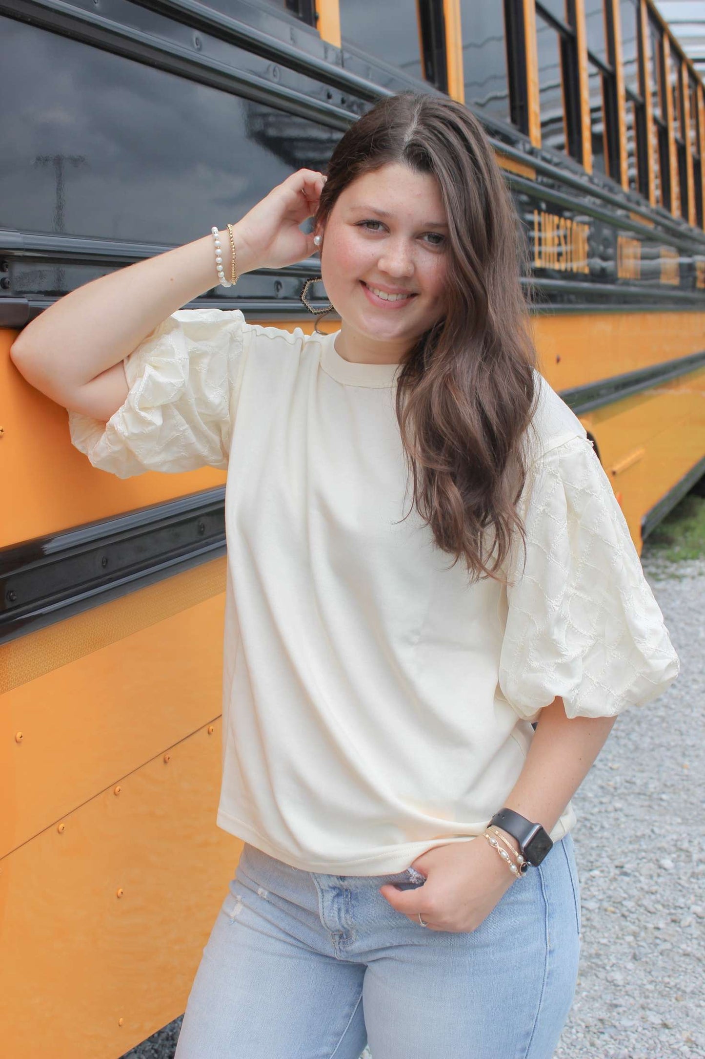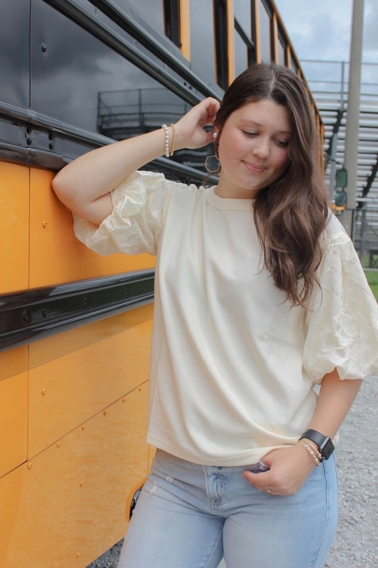 This top features a unique texture and bubble sleeve, making it a stylish addition to your wardrobe. With a comfortable and flattering round neck, it offers both fashion and comfort. Perfect for any occasion, this top is a must-have for any fashion-forward individual.