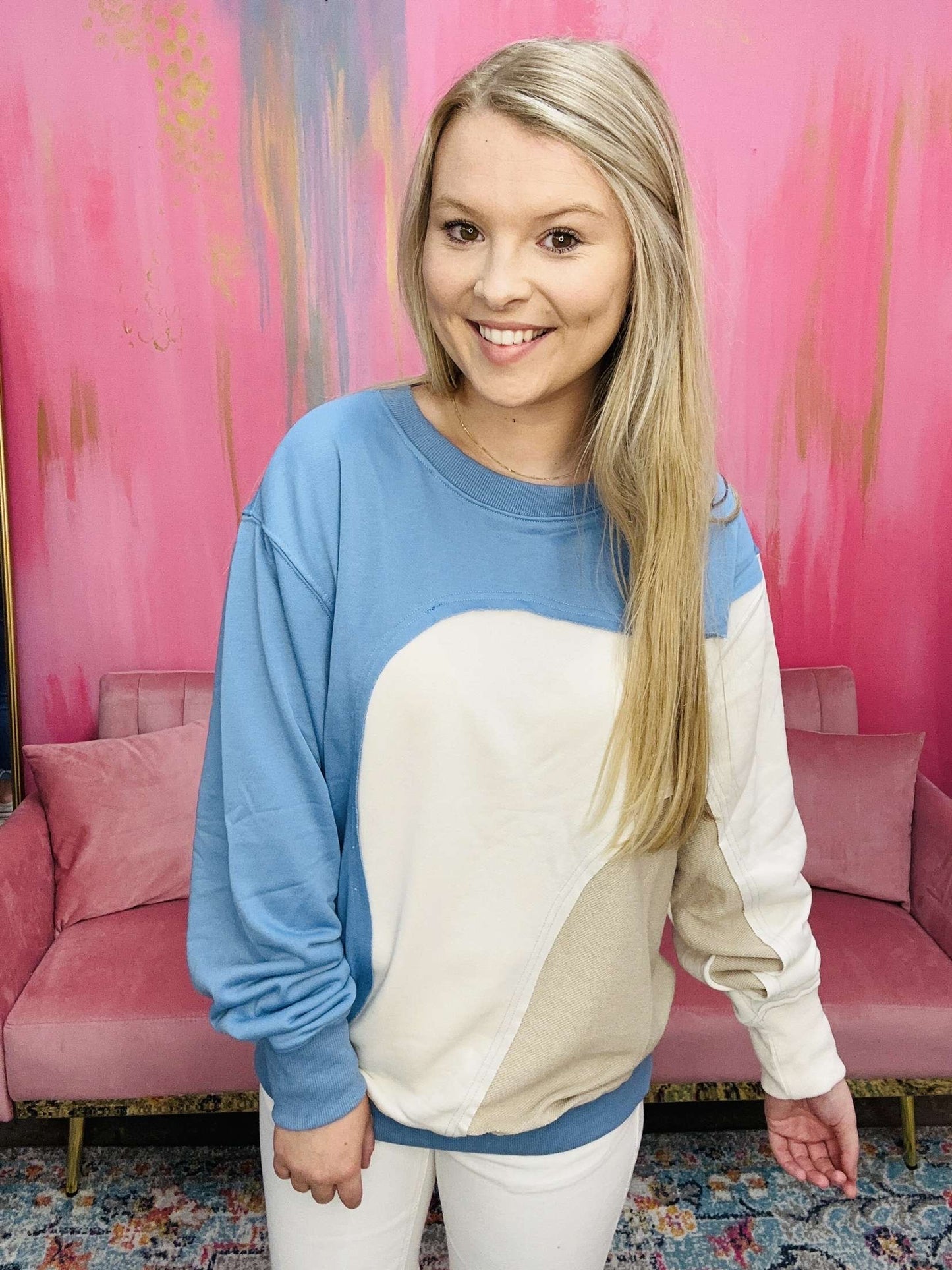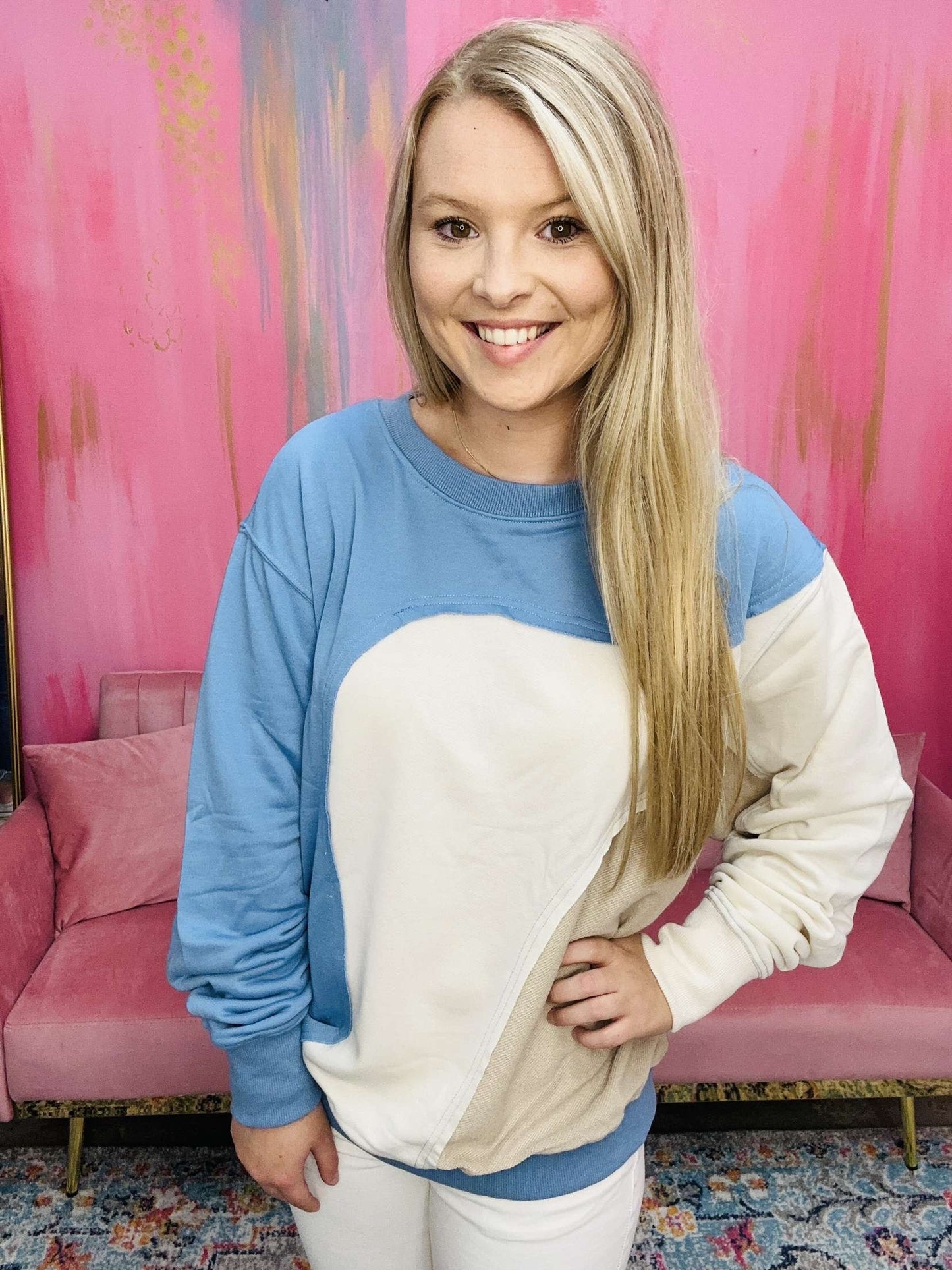 The Valeria Sweatshirt is the perfect addition to any wardrobe. An oversized fit with color blocked detailing, exposed seaming and a comfortable fit give this piece a unique, lived-in look. Upgrade your sweater game with effortless style.