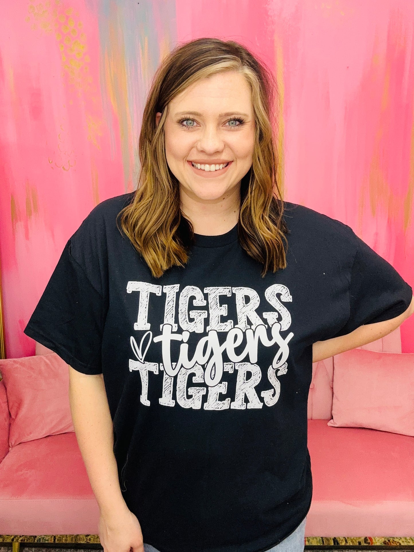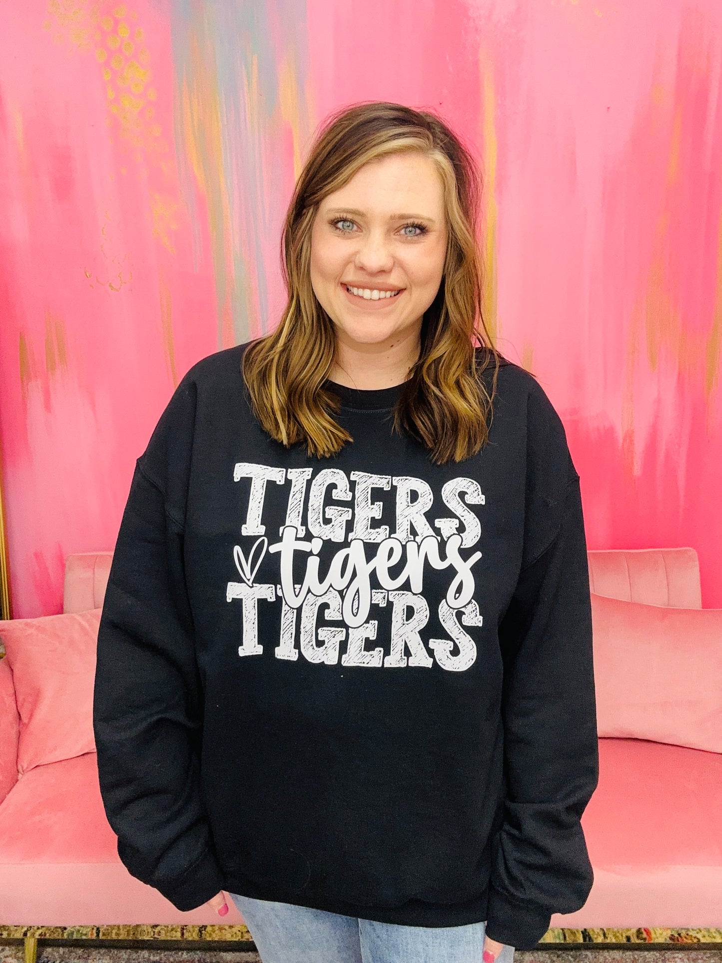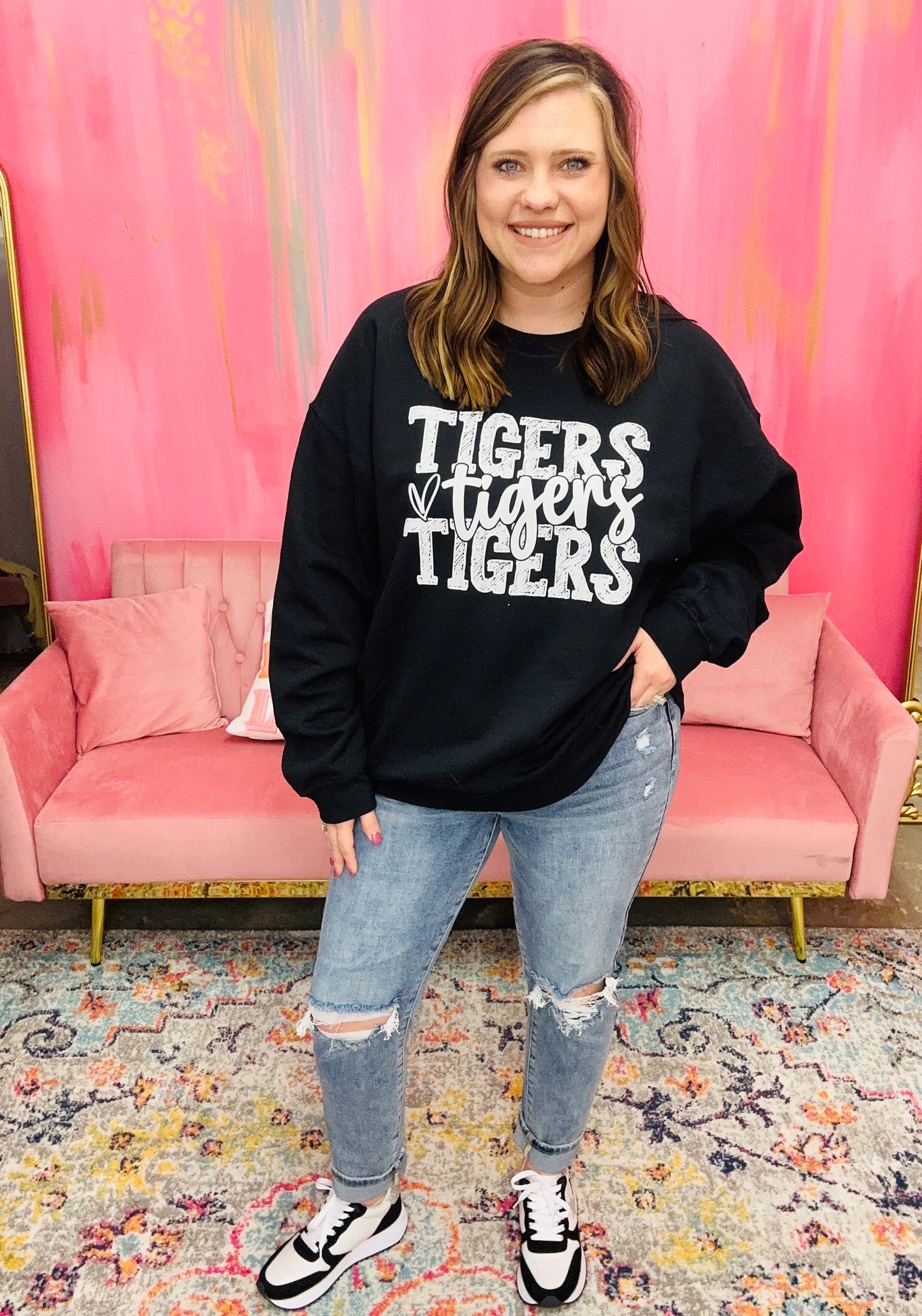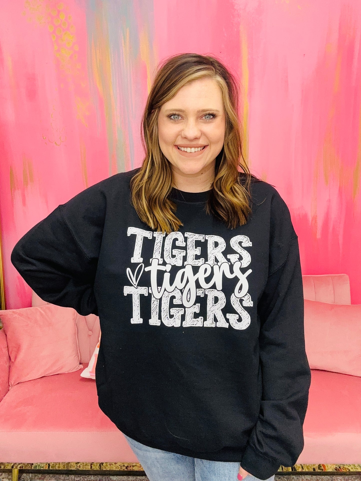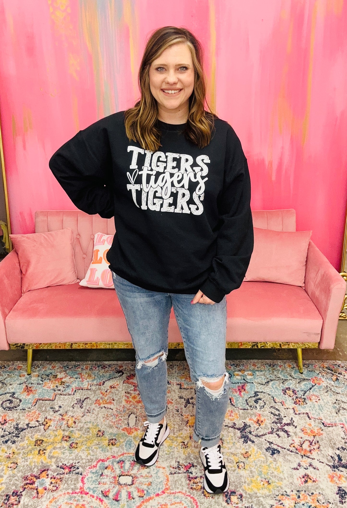 Introducing TIGERS TIGERS TIGERS, featuring a white tigers design on Gildan brand t-shirts and sweatshirts. Choose from a black t-shirt or sweatshirt and enjoy heavyweight construction and a true-to-size fit. The perfect piece for our Tigers fans!