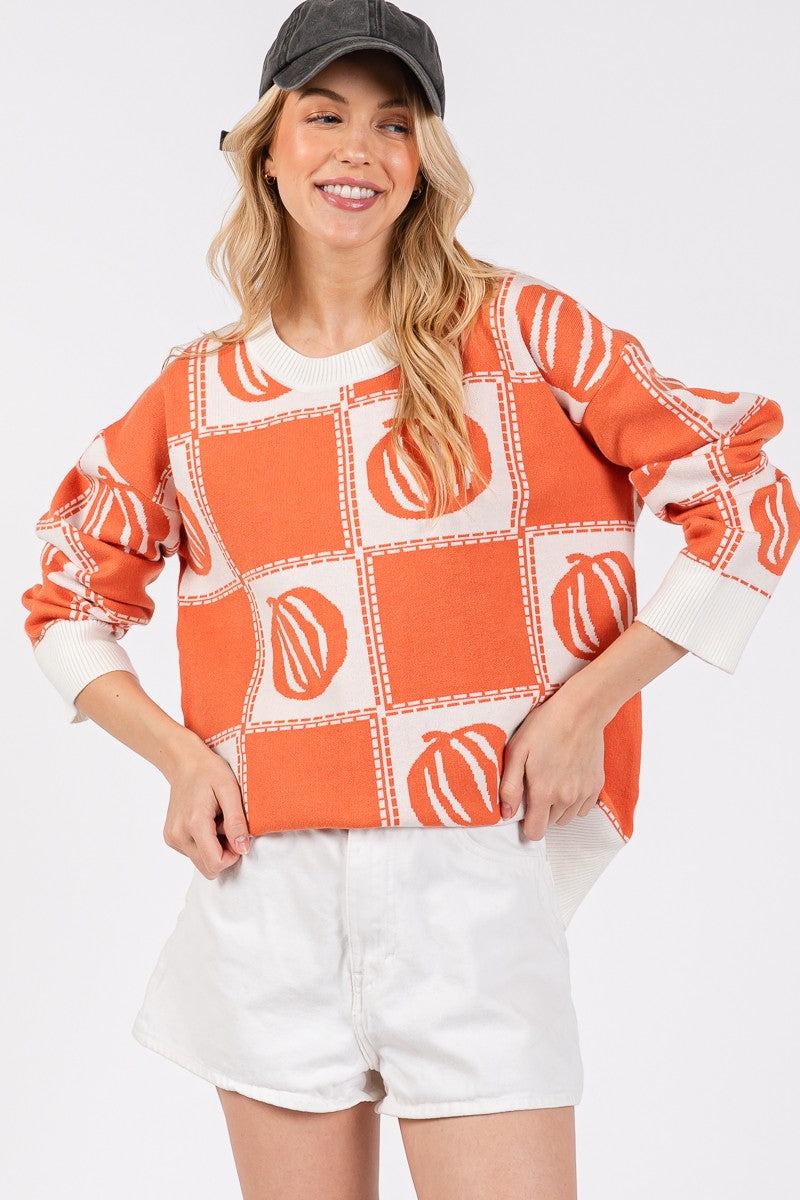 The Pumpkin Print Sweater Top is a cozy, fall-inspired piece featuring a playful pumpkin design. Made from soft, comfortable fabric, it's perfect for adding a touch of seasonal charm to your wardrobe. With its relaxed fit and warm tones, this sweater pairs well with jeans or leggings for a casual yet festive look, ideal for chilly autumn days and seasonal gatherings. Perfect for pumpkin patch visits, Halloween, thanksgiving, autumn strolls, or any seasonal gathering. Embrace the spirit of fall with this delightful sweater!