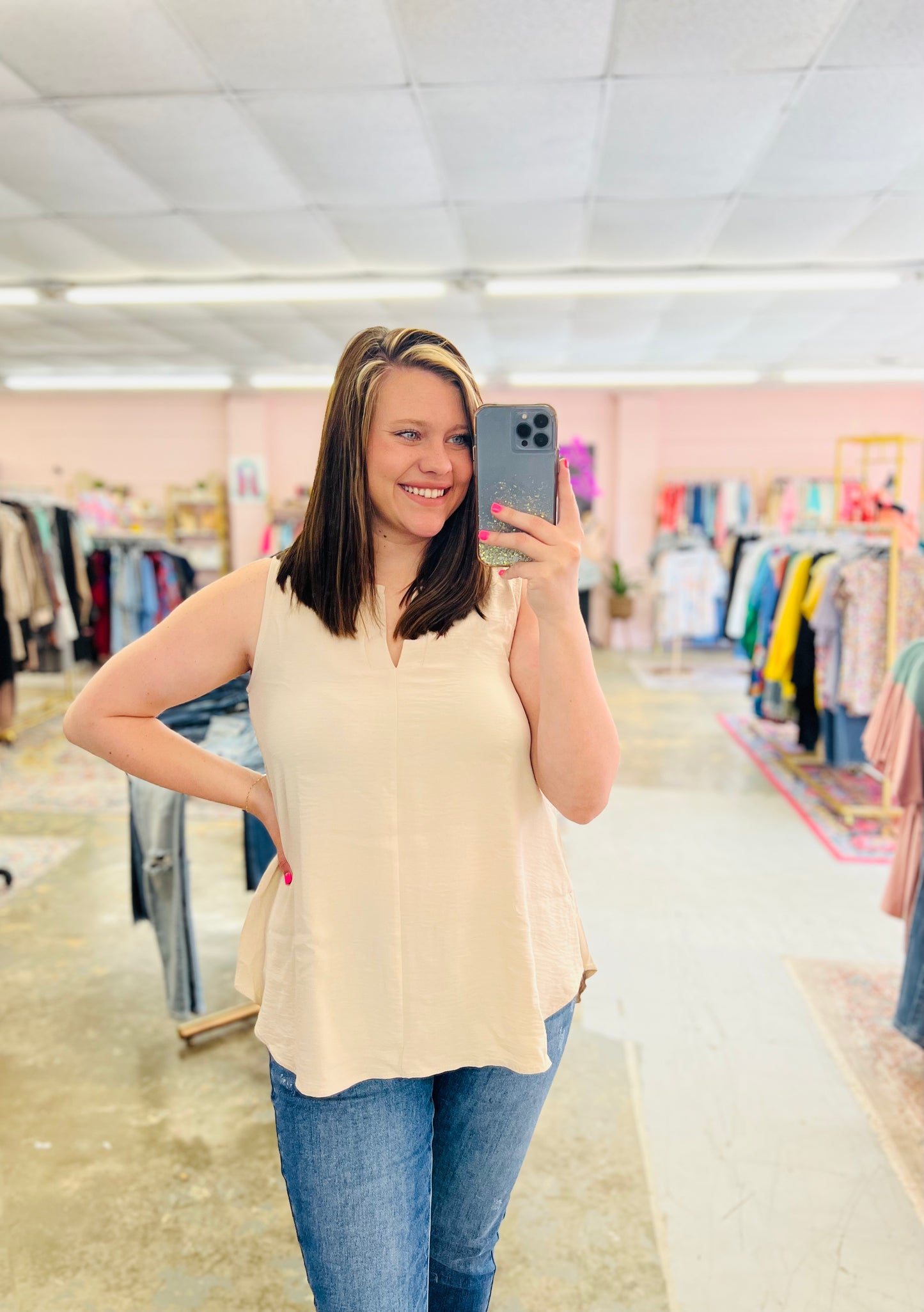 This is a solid polyester tank top featuring a v neckline and round hem.