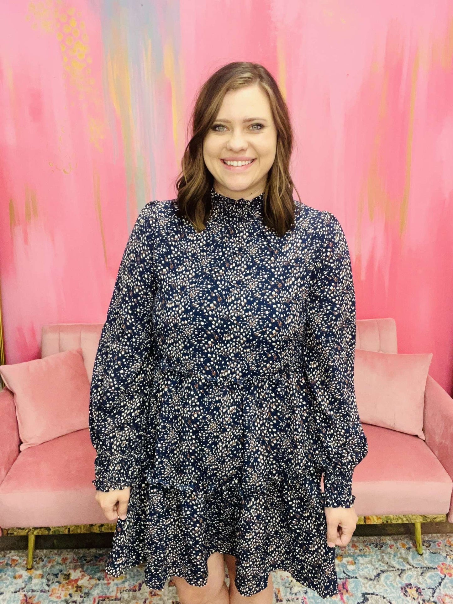 This stylish dress features smocking on the neck and cuff, and a back opening complete with ribbon tie for an elegant fit. Additionally, mini ruffles add a romantic touch to this charming design.