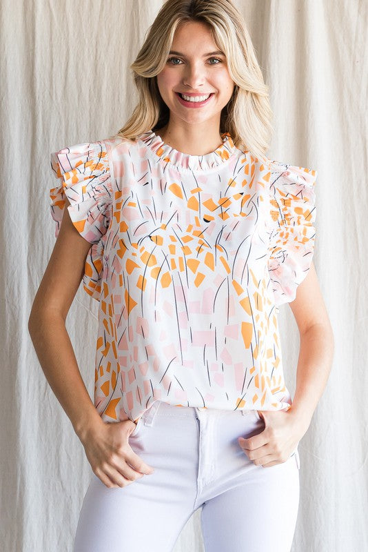 This print top features a frilled neck, back keyhole, smocked ruffled shoulder, and vented hemline. Crafted from a lightweight, non-sheer fabric, it offers comfort and versatility for any occasion. Elevate your wardrobe with this stylish and feminine piece.