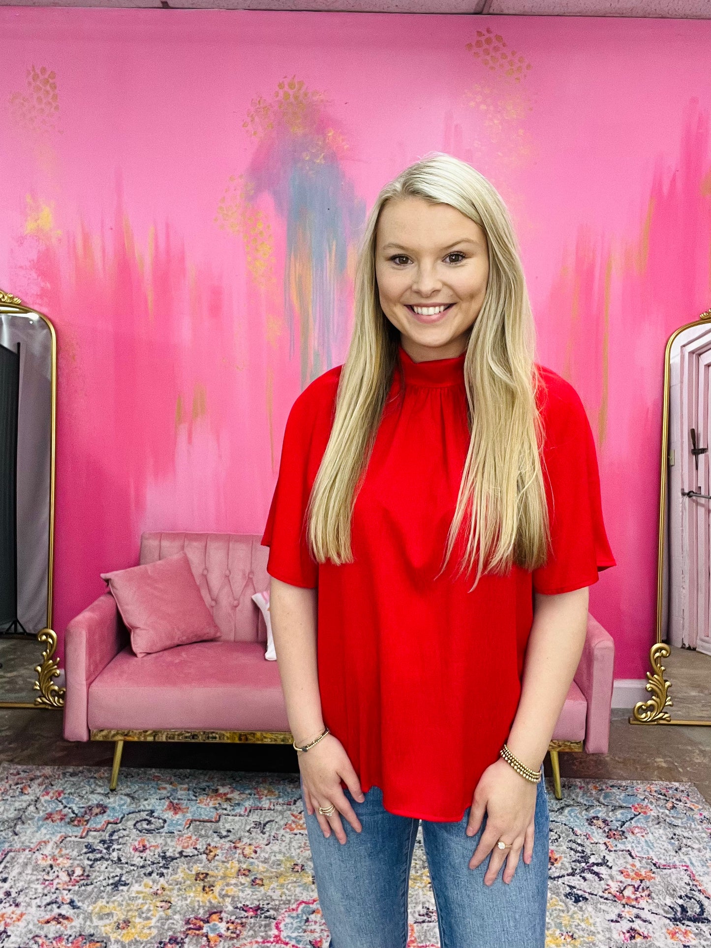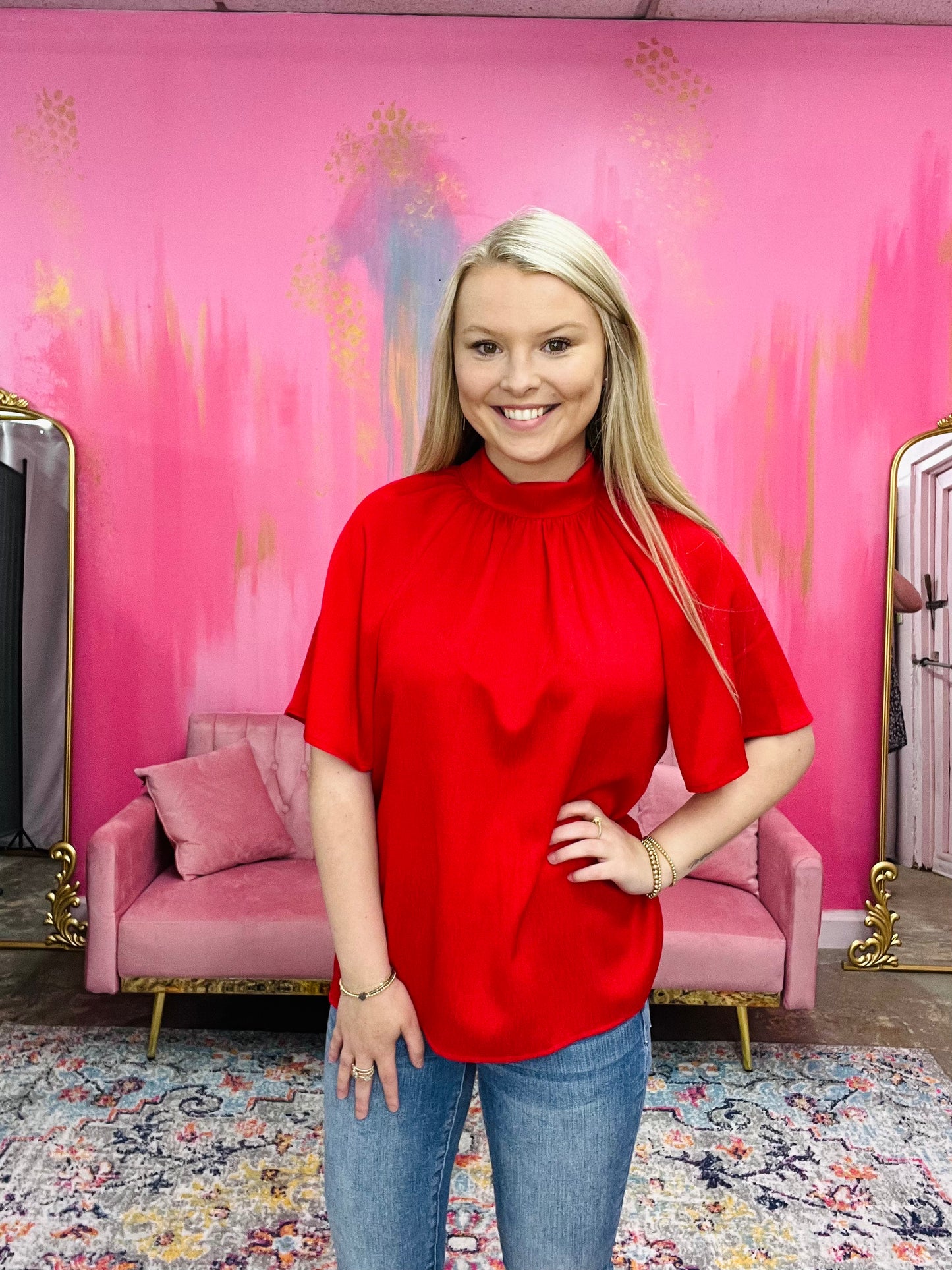 Experience effortless elegance with this solid flutter sleeve blouse. Carefully crafted with adjustable back neck tie and gathered detail along neckline, it's made from a lightweight woven textured crepe fabric for a beautiful and comfortable fit. Feel confident and stylish in this timeless design.