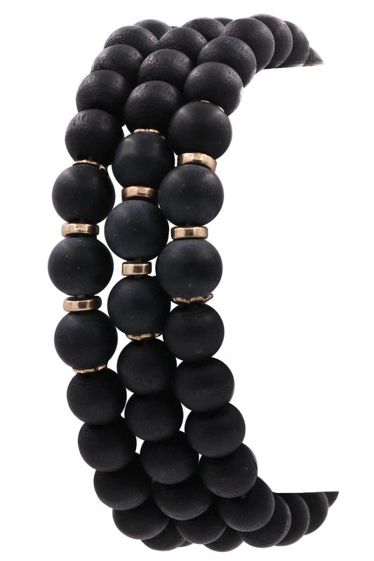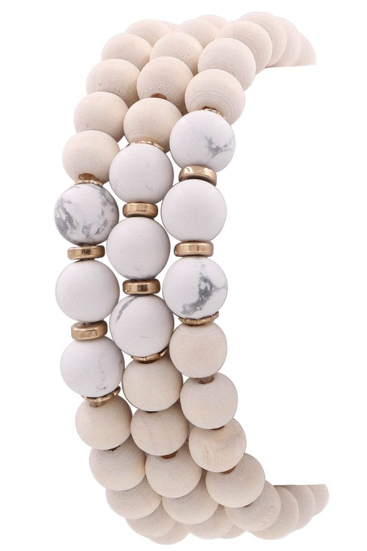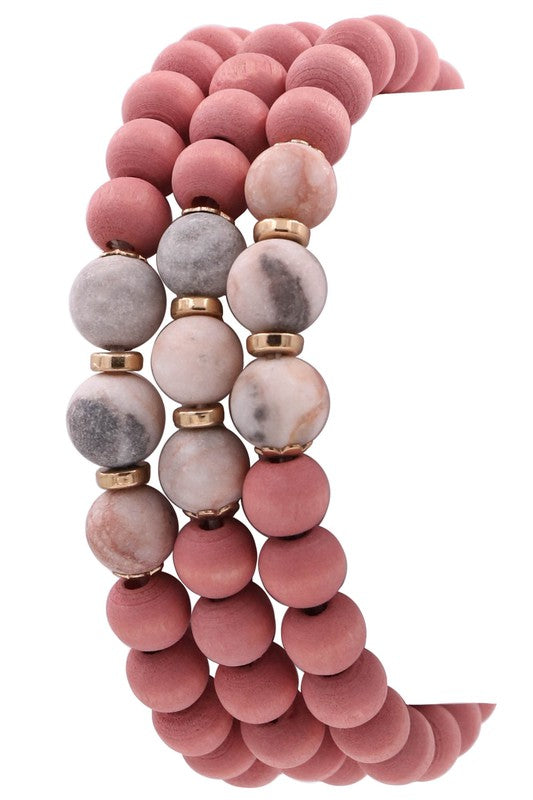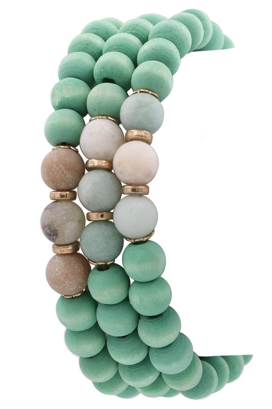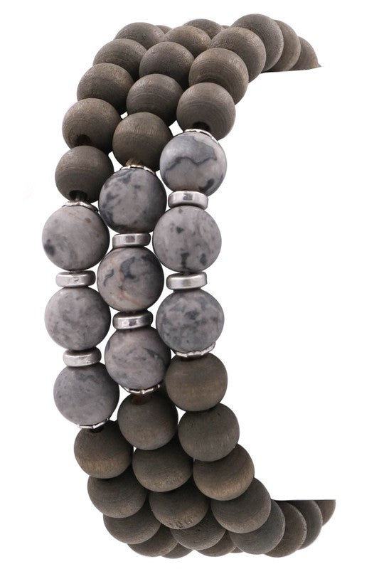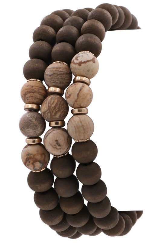This stylish and versatile set of three wood bead semi-precious stone stretch bracelets come in an elastic design perfect for any occasion. Crafted from wood and semi-precious stones, their comfortable and adjustable design lets you find the perfect fit that's right for you.